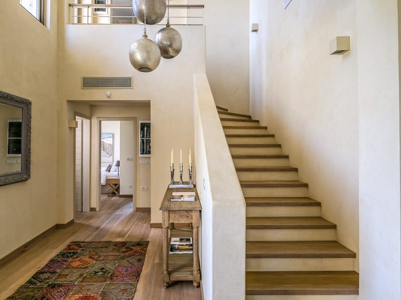 From the striking main entry and its large arched doors, to the notably spacious interior of the entry hall and its double-height ceiling. Opposite, a large bay window allows the sunlight to reflect the colors of the garden off the interior’s earthy tones, with its simple, refined lines and resoundingly tasteful touches. To the right, a staircase leads to the first floor and the master bedroom, and is adorned with impressive ethnic-inspired lighting fixtures that were lovingly selected by the owners of the villa.