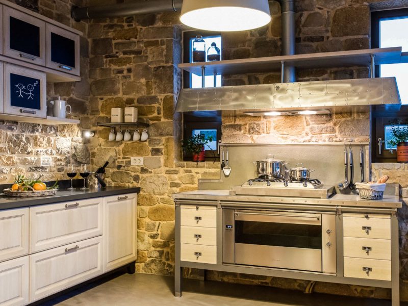 The interior dining area boasts a large untreated wood table resting on wrought iron legs with bench seating on one side and 4 comfortable armchairs on the other. Opposite the unique dining table and through a stunning arch, the kitchen: an homage to the fine art of design outfitted in the unmistakably striking Marchi vintage style, contemporary and highly functional, with a retro feel that inspires gastronomical creativity.