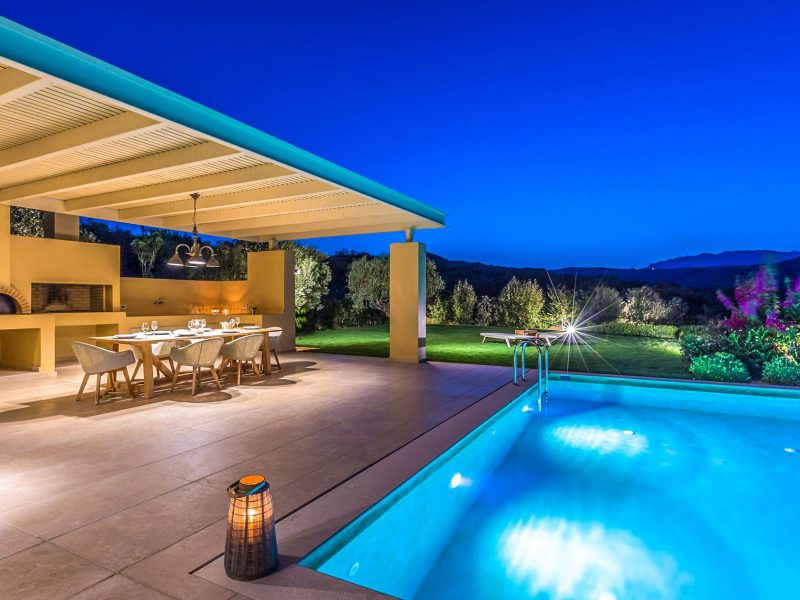 Exterior facilities/amenities: Covered patios, 1 outdoor dining area, sitting area with built-in sofas, outdoor kitchen with a wood-burning oven and covered BBQ area, 60 m² infinity pool for adults, 12 m² children’s pool (0.50 cm deep), outdoor shower.
