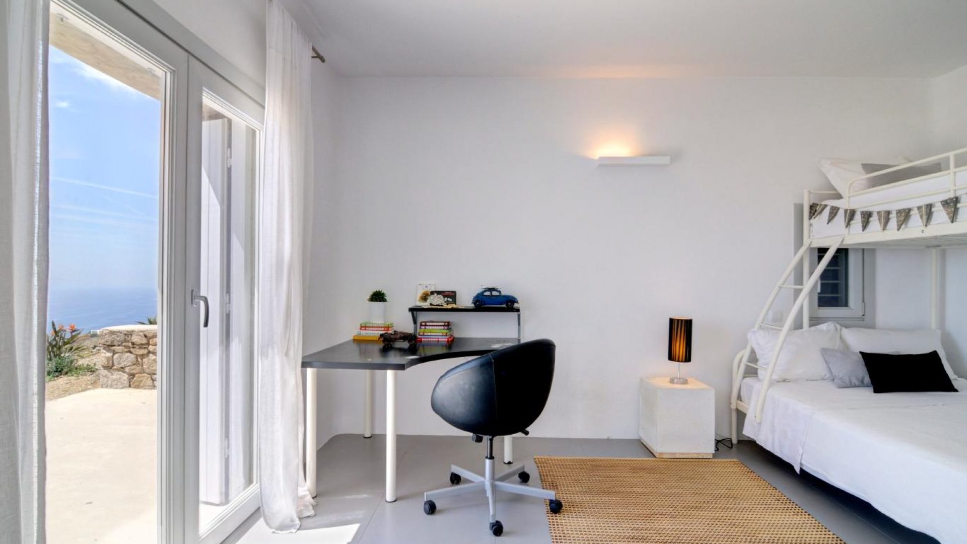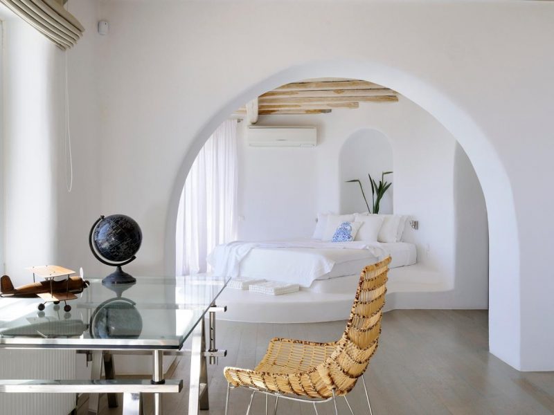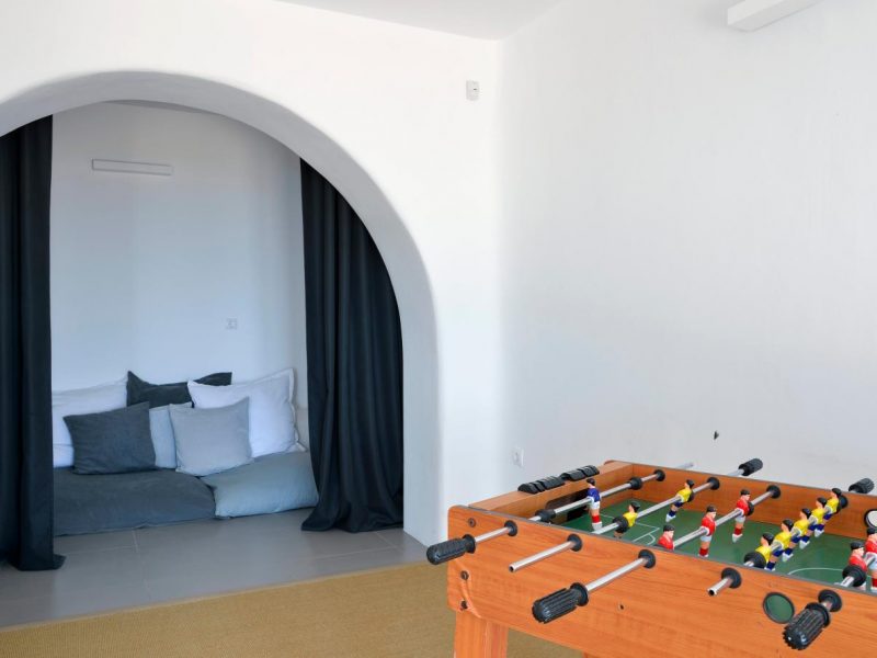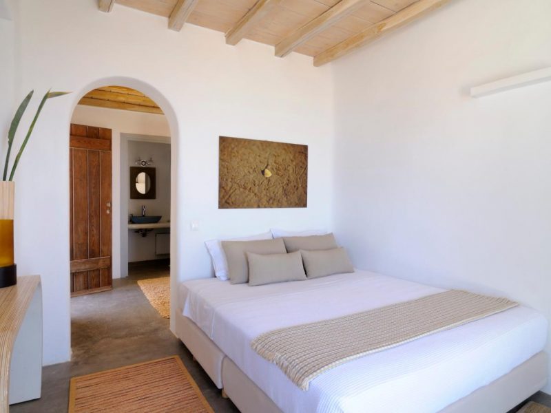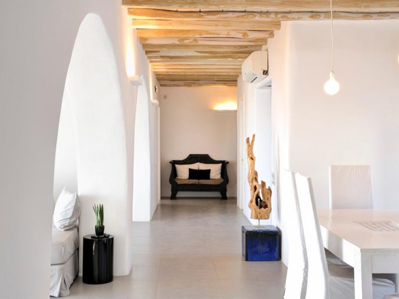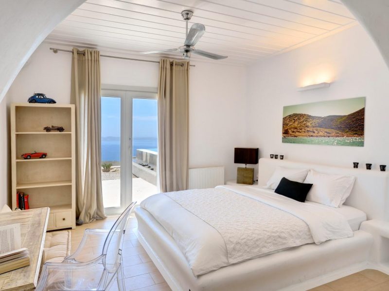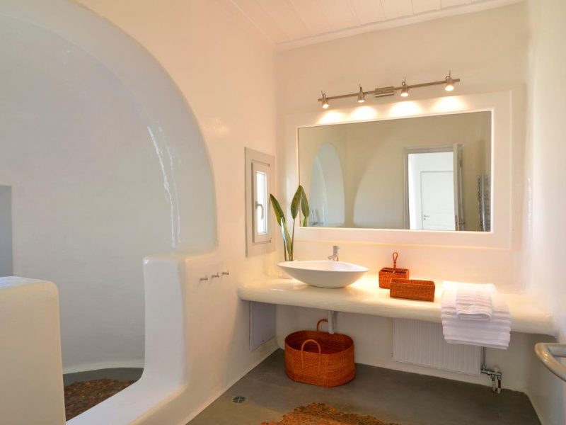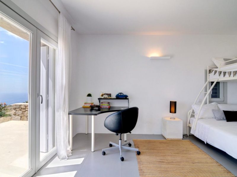 Villa Ocean Dream is comprised of two separate, adjacent buildings. The first building features a spacious living room area with a guest bathroom, leading up to a minimal dining area, fully equipped kitchen and a second lavish circular sitting area. Moreover, a luxurious master suite with en-suite bathroom can accommodate 2 guests with direct access to the exterior amazing lounge area. On the upper floor there is a master bedroom with en-suite bathroom and a sitting area with a large sofa and a designated office area , while on the ground floor, there are two bedrooms with en-suite bathrooms. Set on two separate levels, the second building features a spacious living room area with a dining area, fully equipped kitchen, WC and three master bedrooms, one of which is a children’s bedroom, featuring bunk beds and affable decorations. The outdoors area is mostly stone-built area in typical Myconian style, consisting of a swimming pool with sun-loungers and day beds, as well as a pergola-shaded dining area with barbecue facilities and its own bathroom.