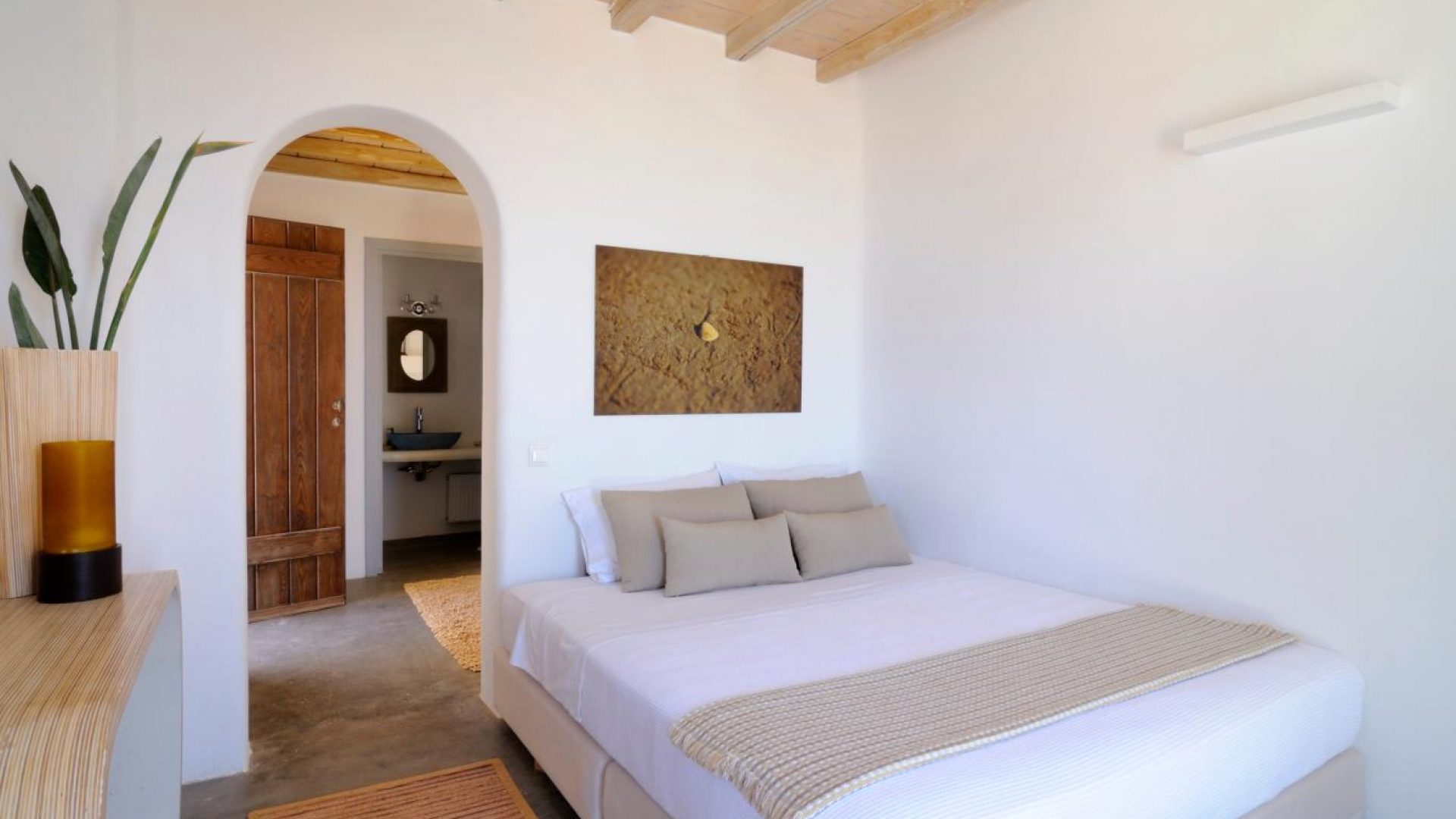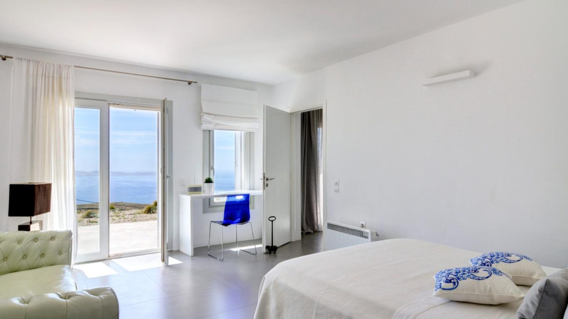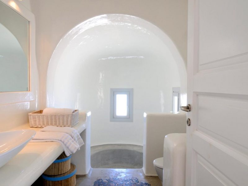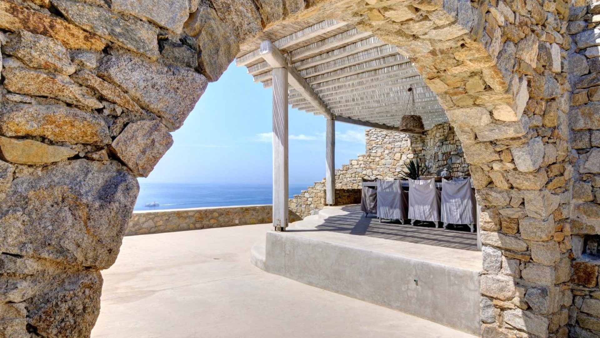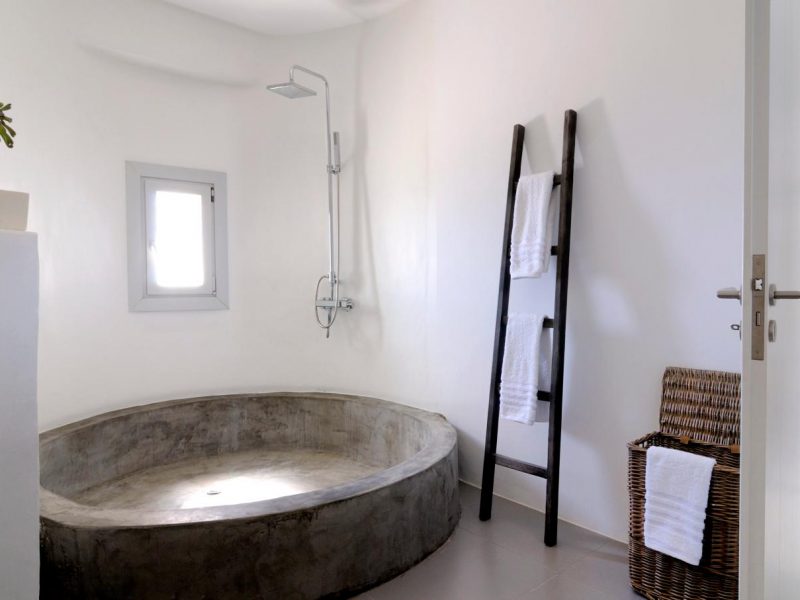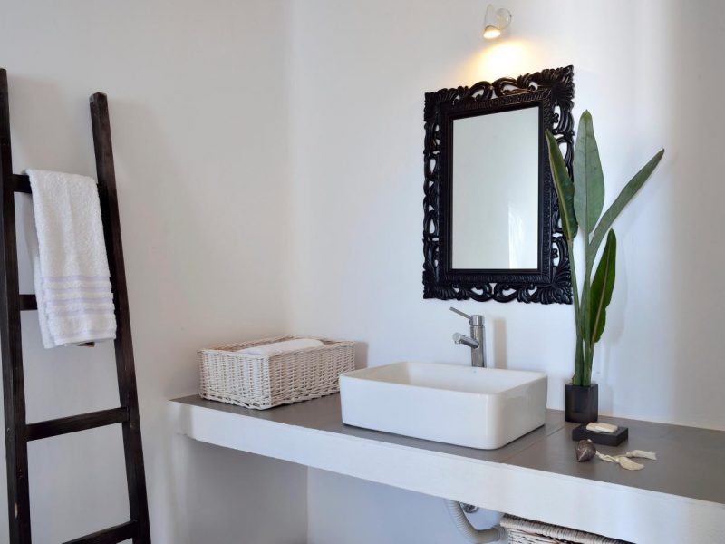 Villa Ocean Dream is comprised of two separate, adjacent buildings. The first building features a spacious living room area with a guest bathroom, leading up to a minimal dining area, fully equipped kitchen and a second lavish circular sitting area. Moreover, a luxurious master suite with en-suite bathroom can accommodate 2 guests with direct access to the exterior amazing lounge area. On the upper floor there is a master bedroom with en-suite bathroom and a sitting area with a large sofa and a designated office area , while on the ground floor, there are two bedrooms with en-suite bathrooms. Set on two separate levels, the second building features a spacious living room area with a dining area, fully equipped kitchen, WC and three master bedrooms, one of which is a children’s bedroom, featuring bunk beds and affable decorations. The outdoors area is mostly stone-built area in typical Myconian style, consisting of a swimming pool with sun-loungers and day beds, as well as a pergola-shaded dining area with barbecue facilities and its own bathroom.