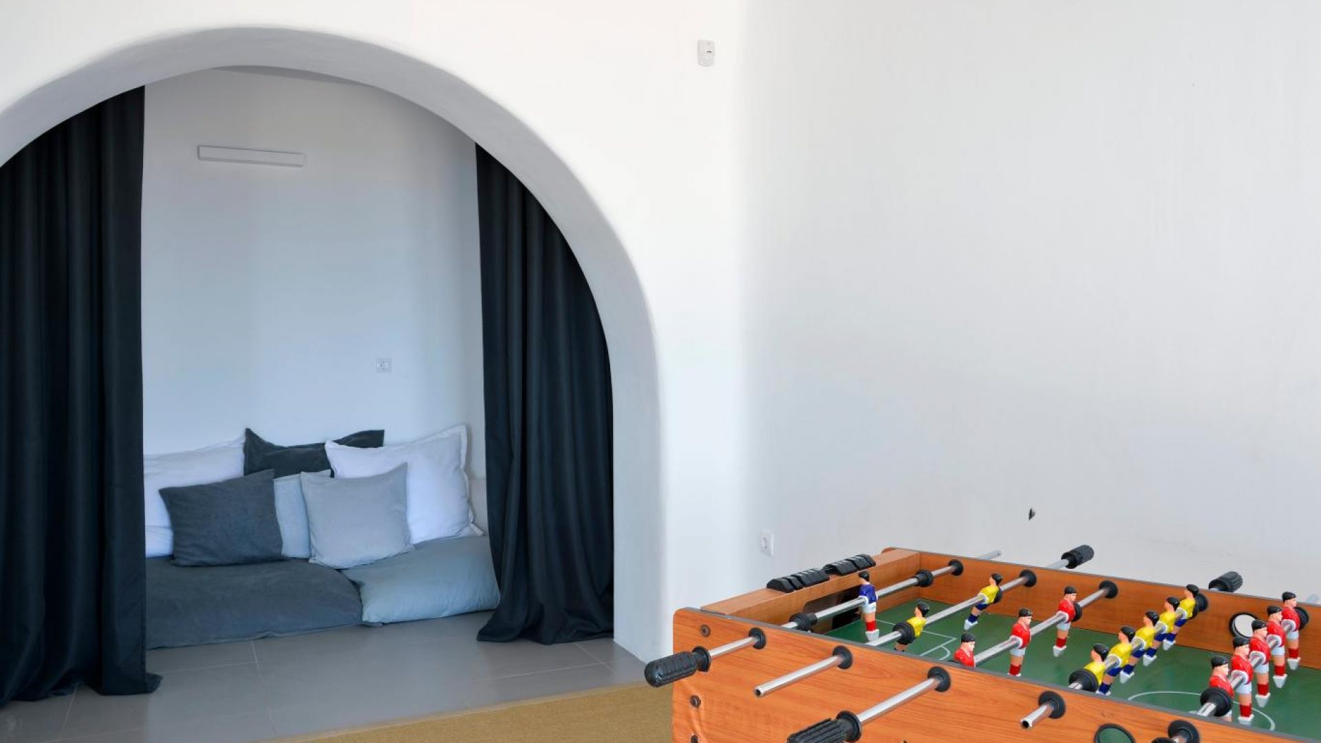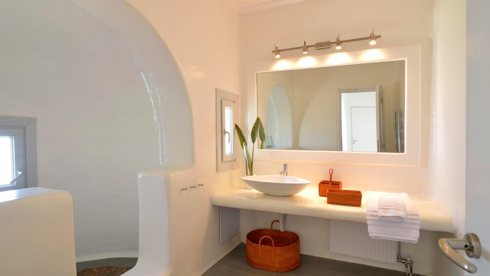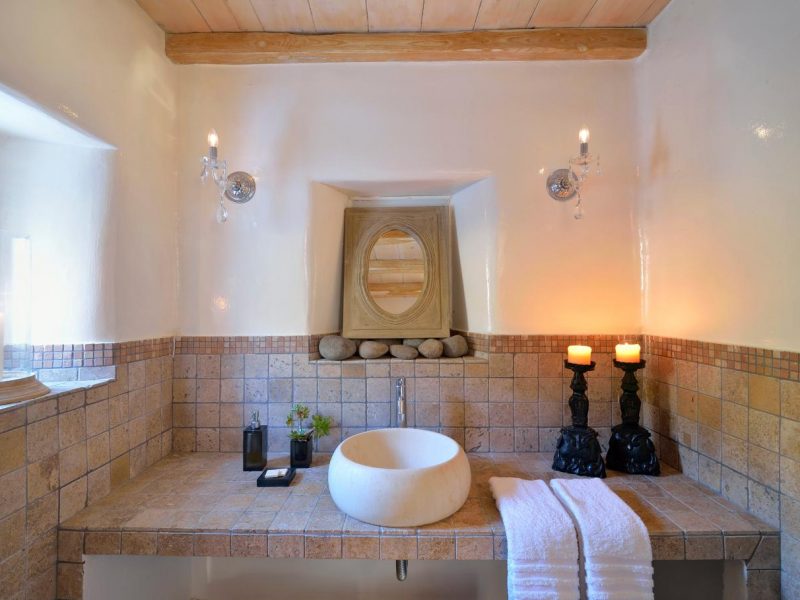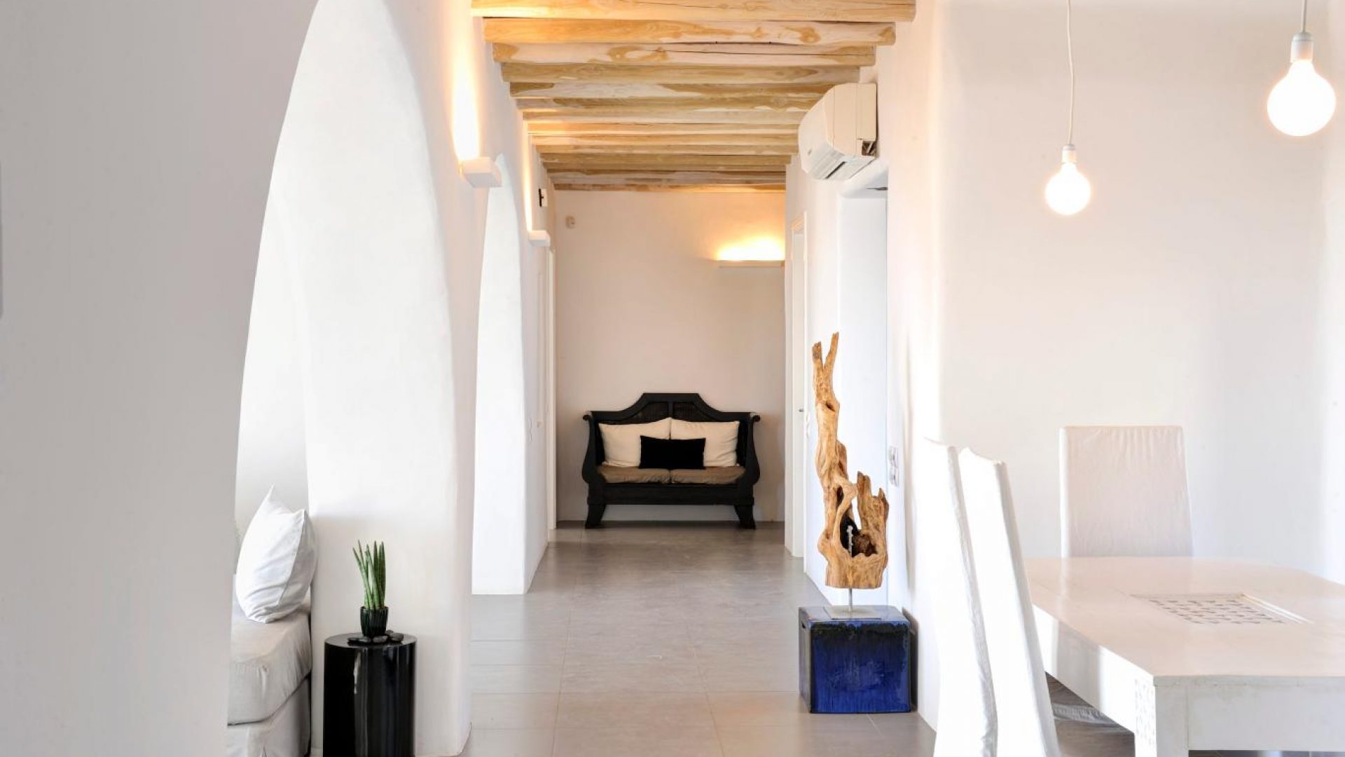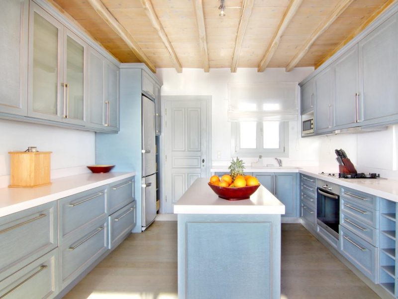 Villa Ocean Dream is comprised of two separate, adjacent buildings. The first building features a spacious living room area with a guest bathroom, leading up to a minimal dining area, fully equipped kitchen and a second lavish circular sitting area. Moreover, a luxurious master suite with en-suite bathroom can accommodate 2 guests with direct access to the exterior amazing lounge area. On the upper floor there is a master bedroom with en-suite bathroom and a sitting area with a large sofa and a designated office area , while on the ground floor, there are two bedrooms with en-suite bathrooms. Set on two separate levels, the second building features a spacious living room area with a dining area, fully equipped kitchen, WC and three master bedrooms, one of which is a children’s bedroom, featuring bunk beds and affable decorations. The outdoors area is mostly stone-built area in typical Myconian style, consisting of a swimming pool with sun-loungers and day beds, as well as a pergola-shaded dining area with barbecue facilities and its own bathroom.