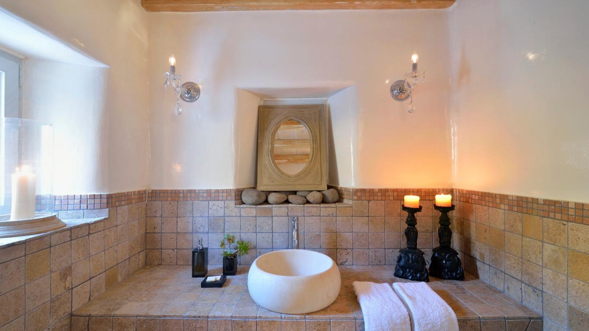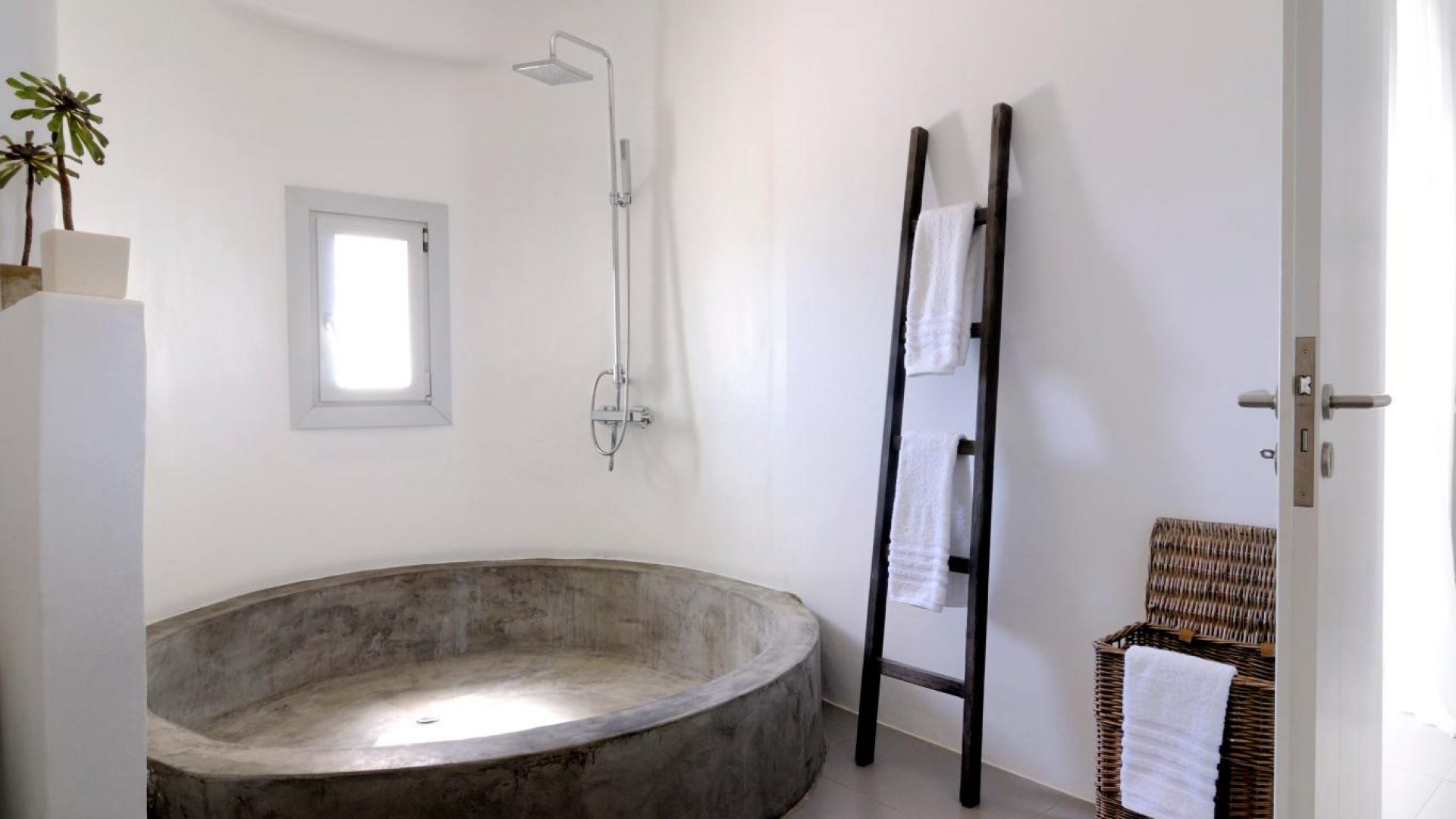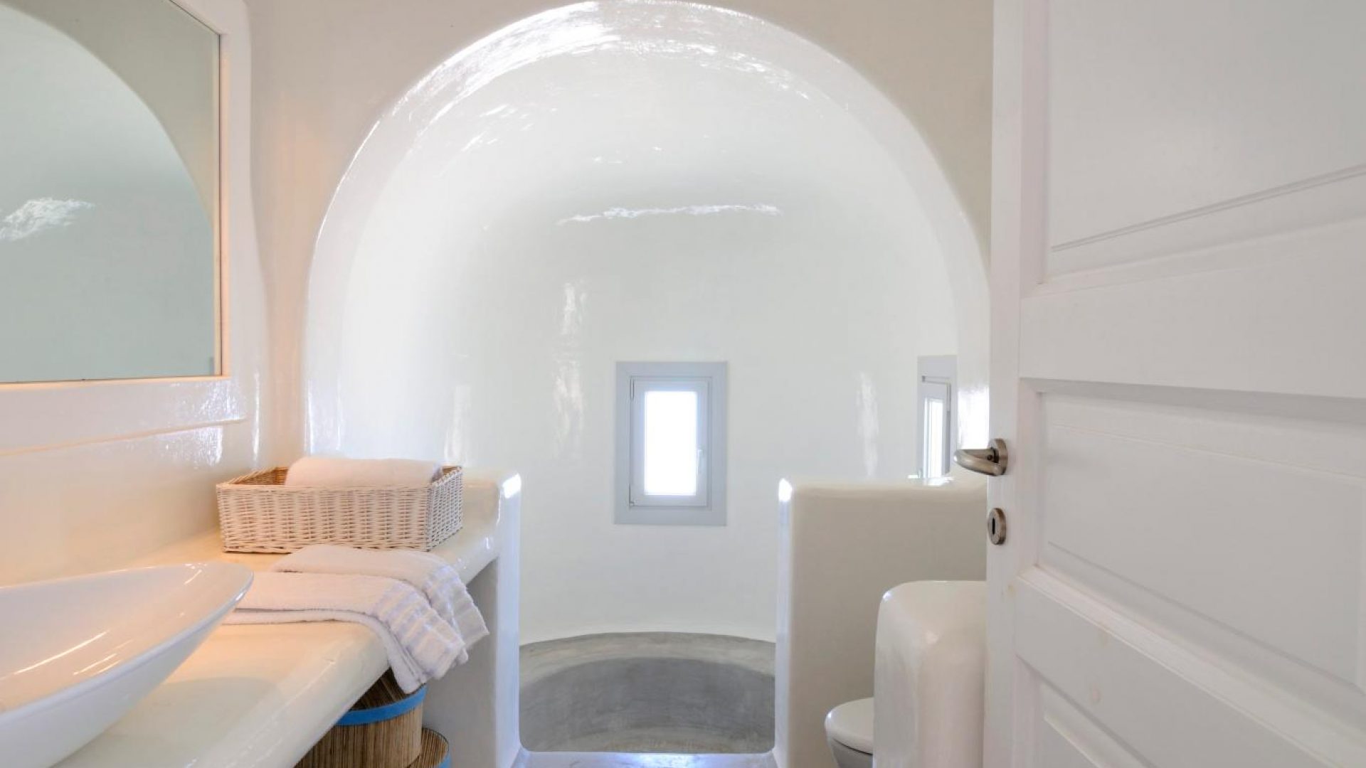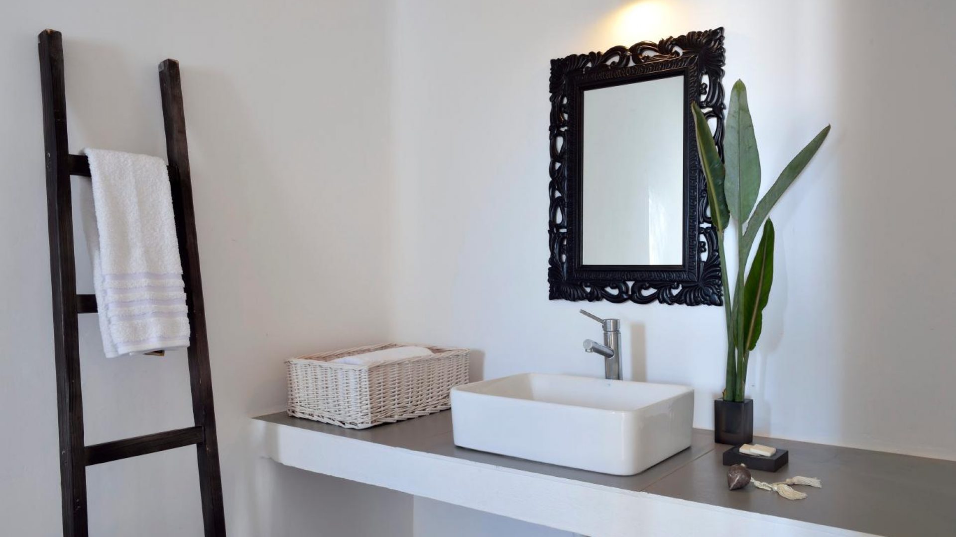 Villa Ocean Dream is comprised of two separate, adjacent buildings. The first building features a spacious living room area with a guest bathroom, leading up to a minimal dining area, fully equipped kitchen and a second lavish circular sitting area. Moreover, a luxurious master suite with en-suite bathroom can accommodate 2 guests with direct access to the exterior amazing lounge area. On the upper floor there is a master bedroom with en-suite bathroom and a sitting area with a large sofa and a designated office area , while on the ground floor, there are two bedrooms with en-suite bathrooms. Set on two separate levels, the second building features a spacious living room area with a dining area, fully equipped kitchen, WC and three master bedrooms, one of which is a children’s bedroom, featuring bunk beds and affable decorations. The outdoors area is mostly stone-built area in typical Myconian style, consisting of a swimming pool with sun-loungers and day beds, as well as a pergola-shaded dining area with barbecue facilities and its own bathroom.