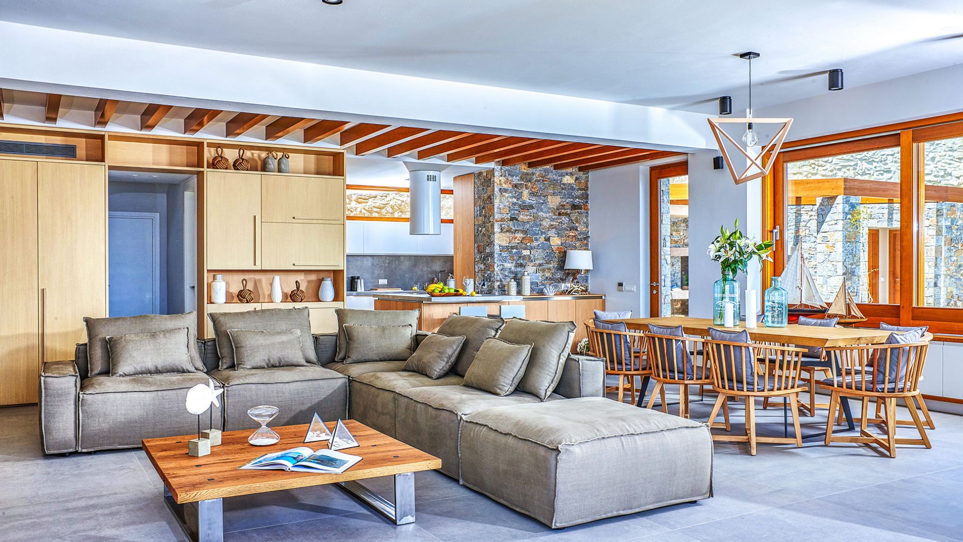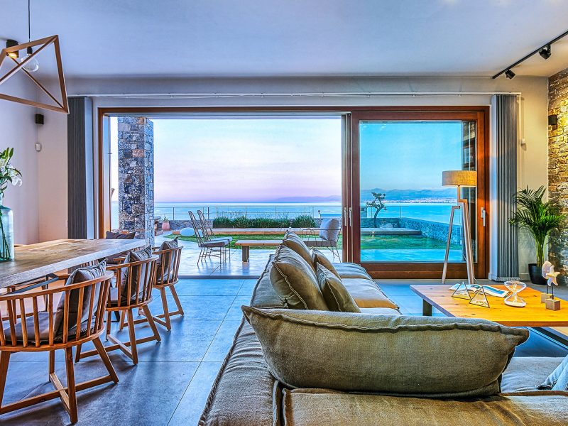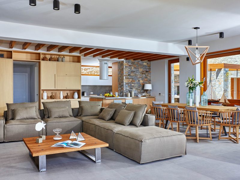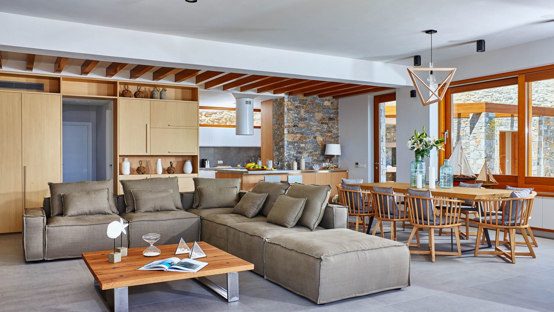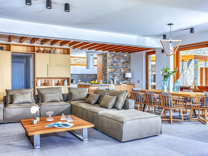 On the ground floor you will find the luxurious open space living room & kitchen area with hand-picked, stylish sofas & specially made furniture for you to enjoy the splendid views & share moments with your friends or family.