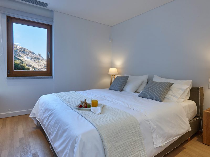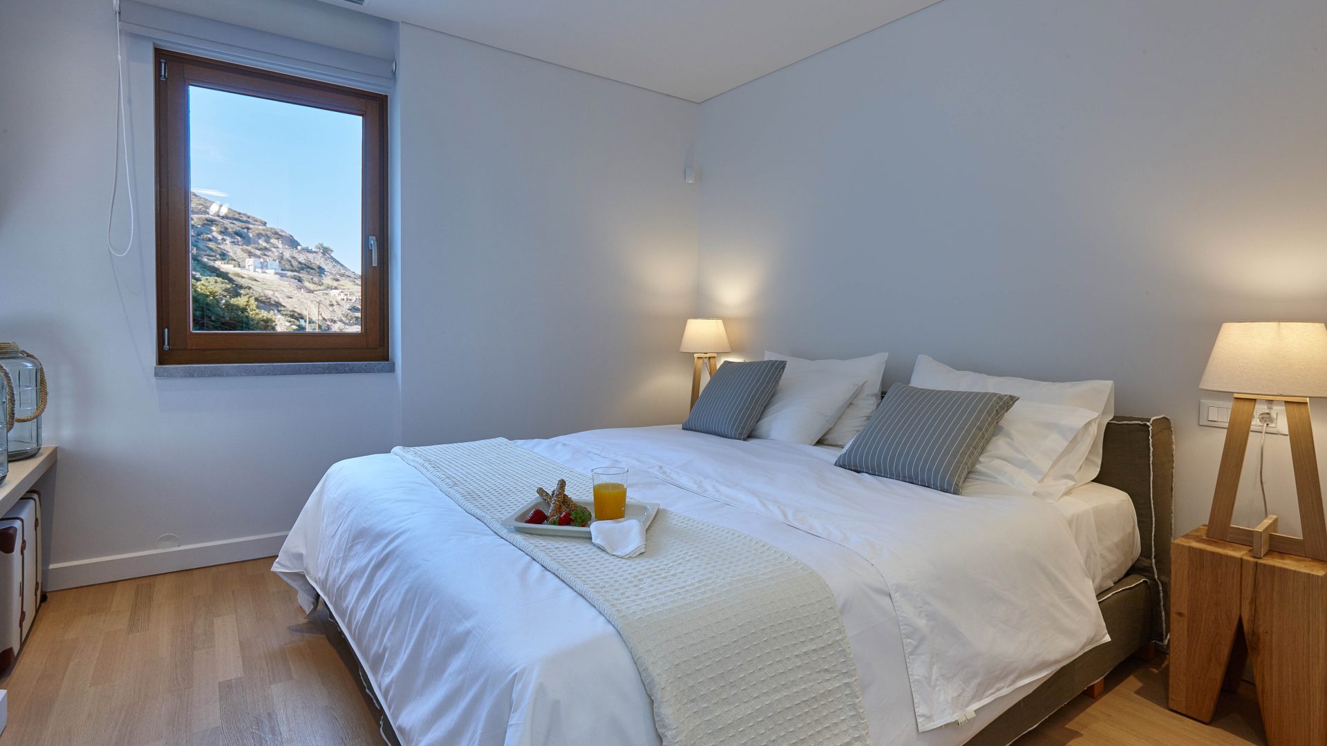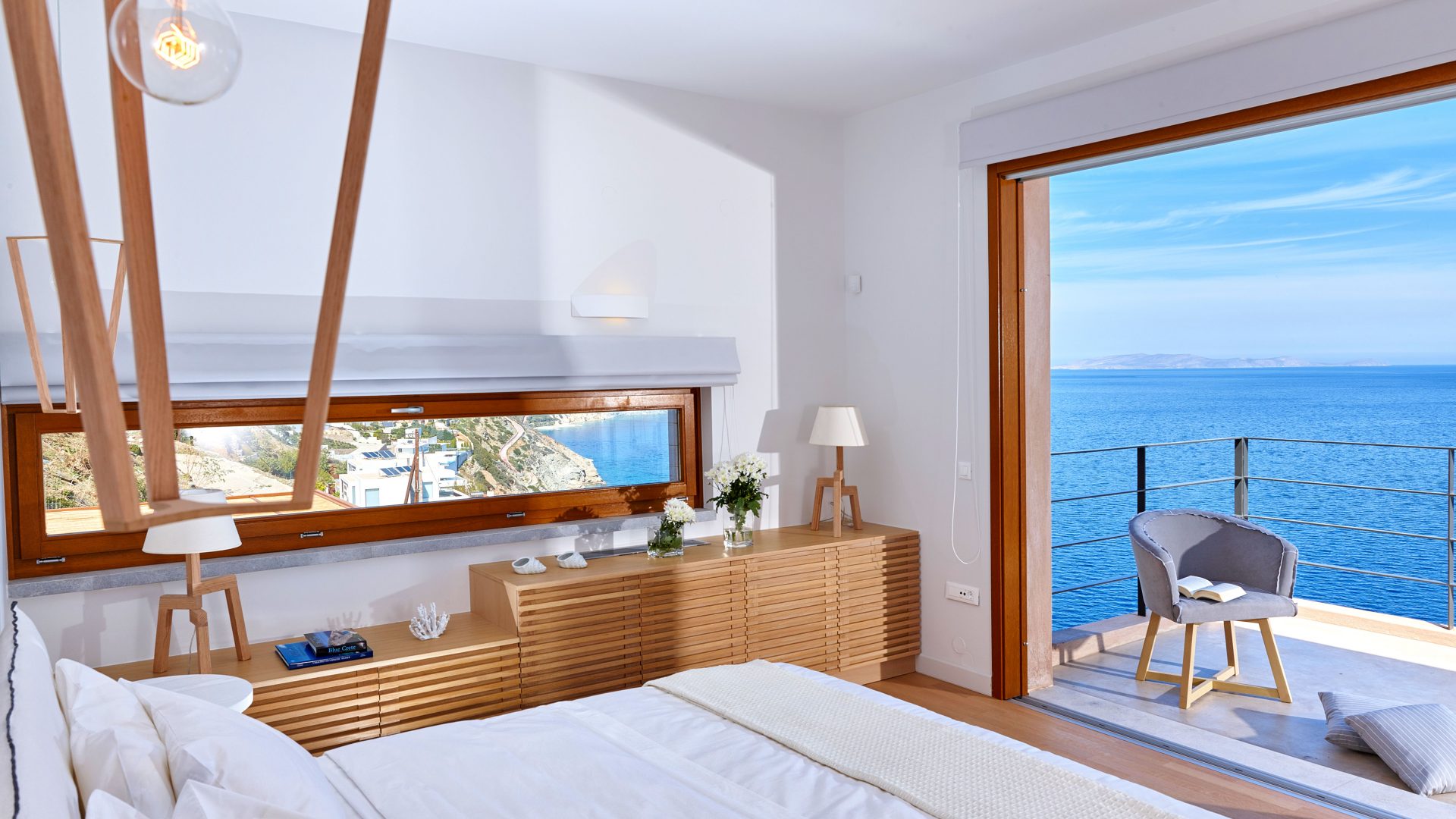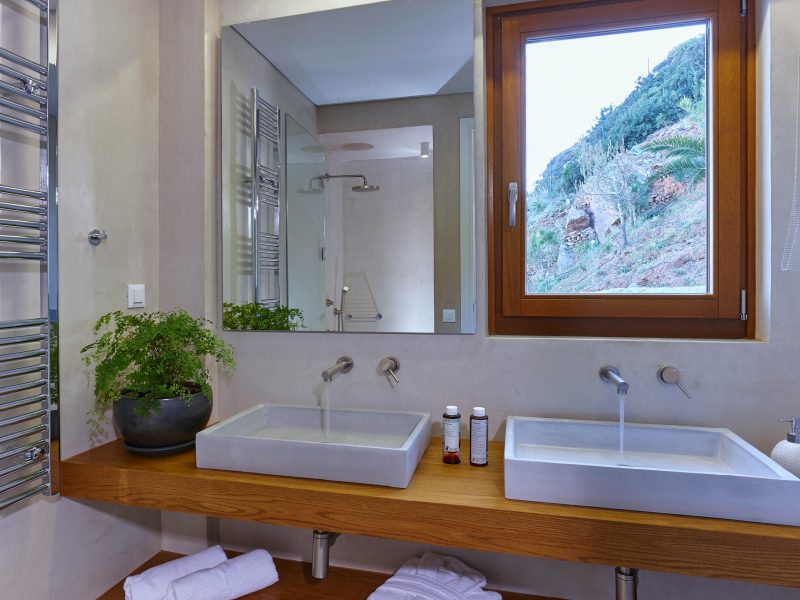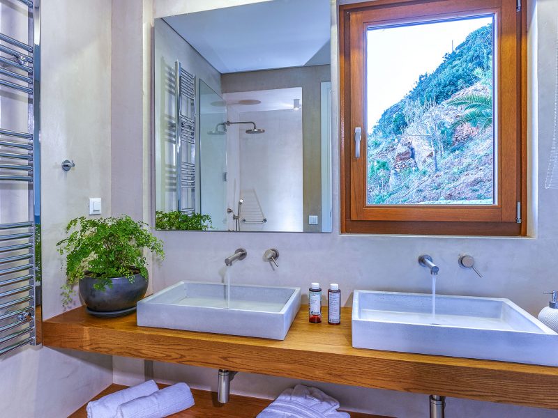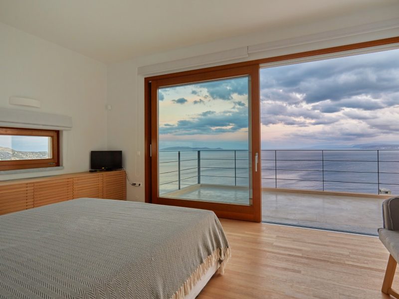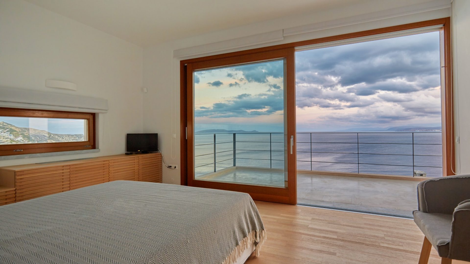 On the first floor there is the Master Bedroom with a suite bathroom offering a spacious jacuzzi bathtub, ideal to relax & enjoy beautiful view through the window with a glass of wine. Its main feature is the amazing view of the horizon & the sea from every corner of the bedroom which entices you to lose yourself with your partner.