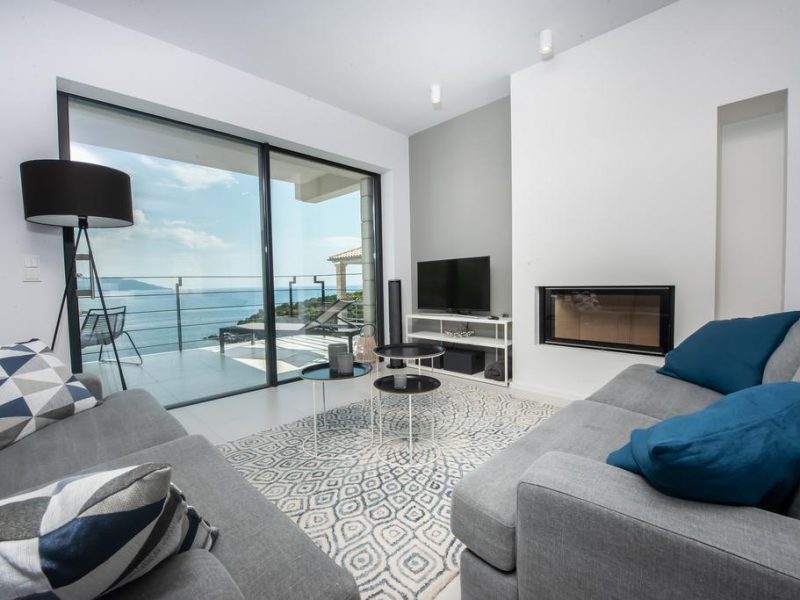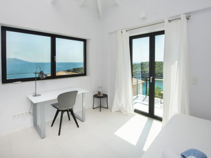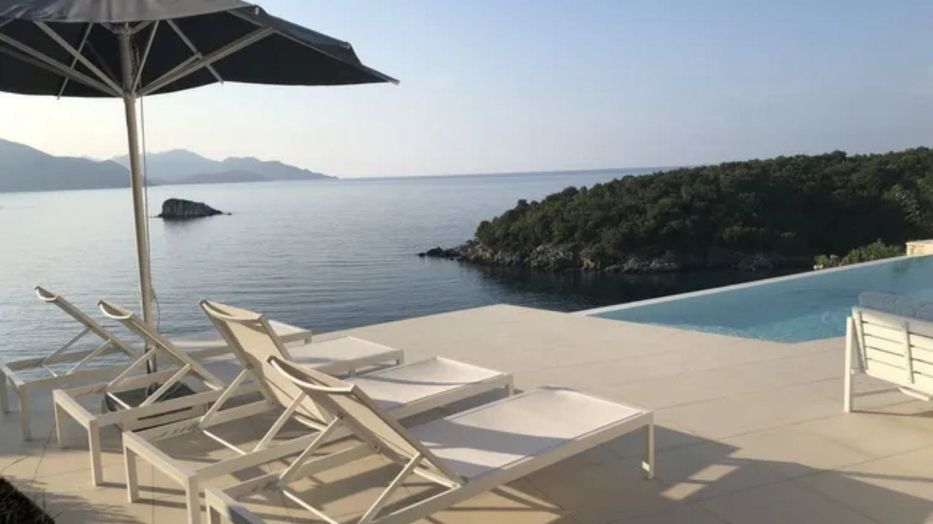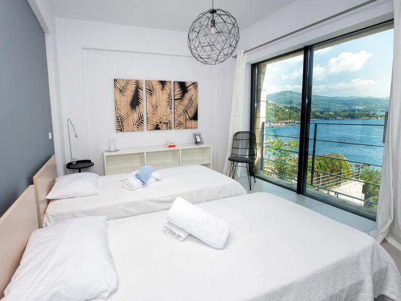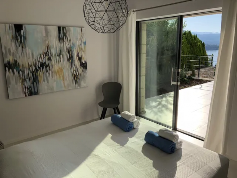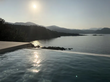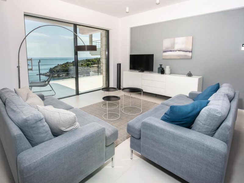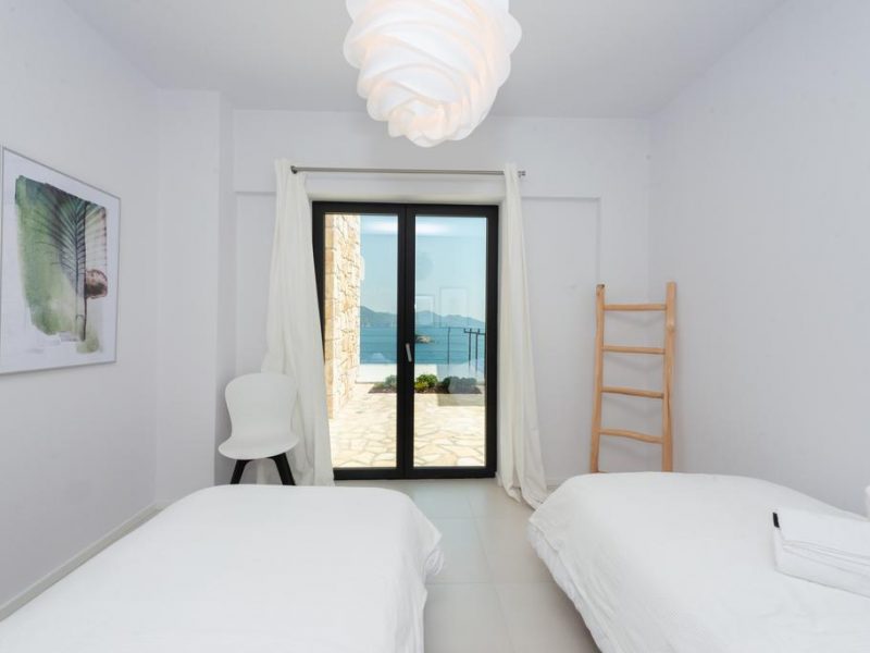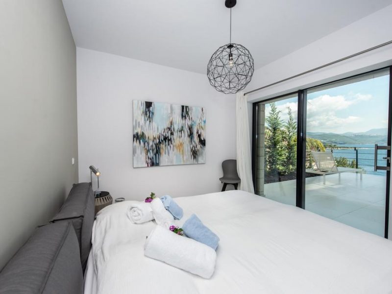 All bedrooms have a wonderful sea view through floor-to-ceiling windows. Below the lower level follows the pool level with sun loungers and an infinity pool. In front of this is a belonging to the villa small hillside garden with olive trees, etc. Next to a narrow path leads directly to a small swimming spot on the water.