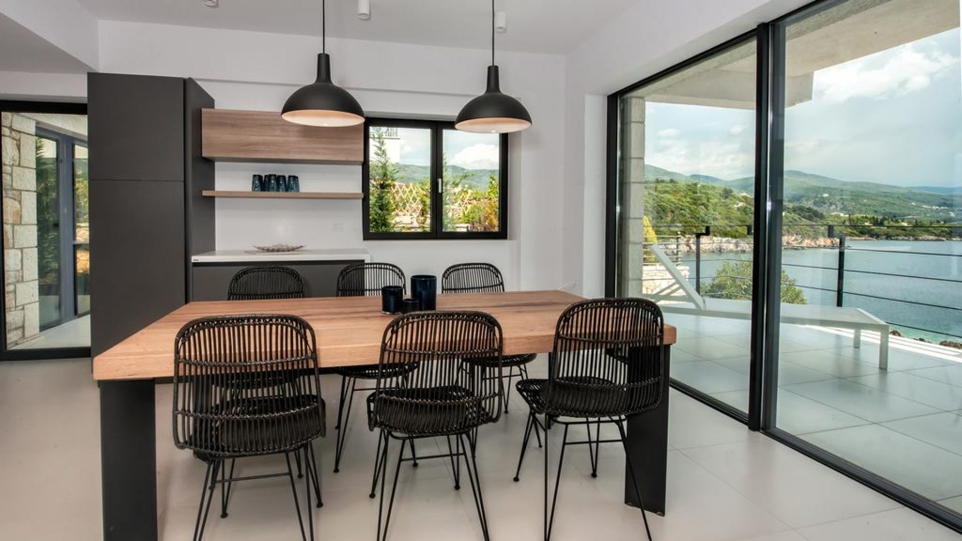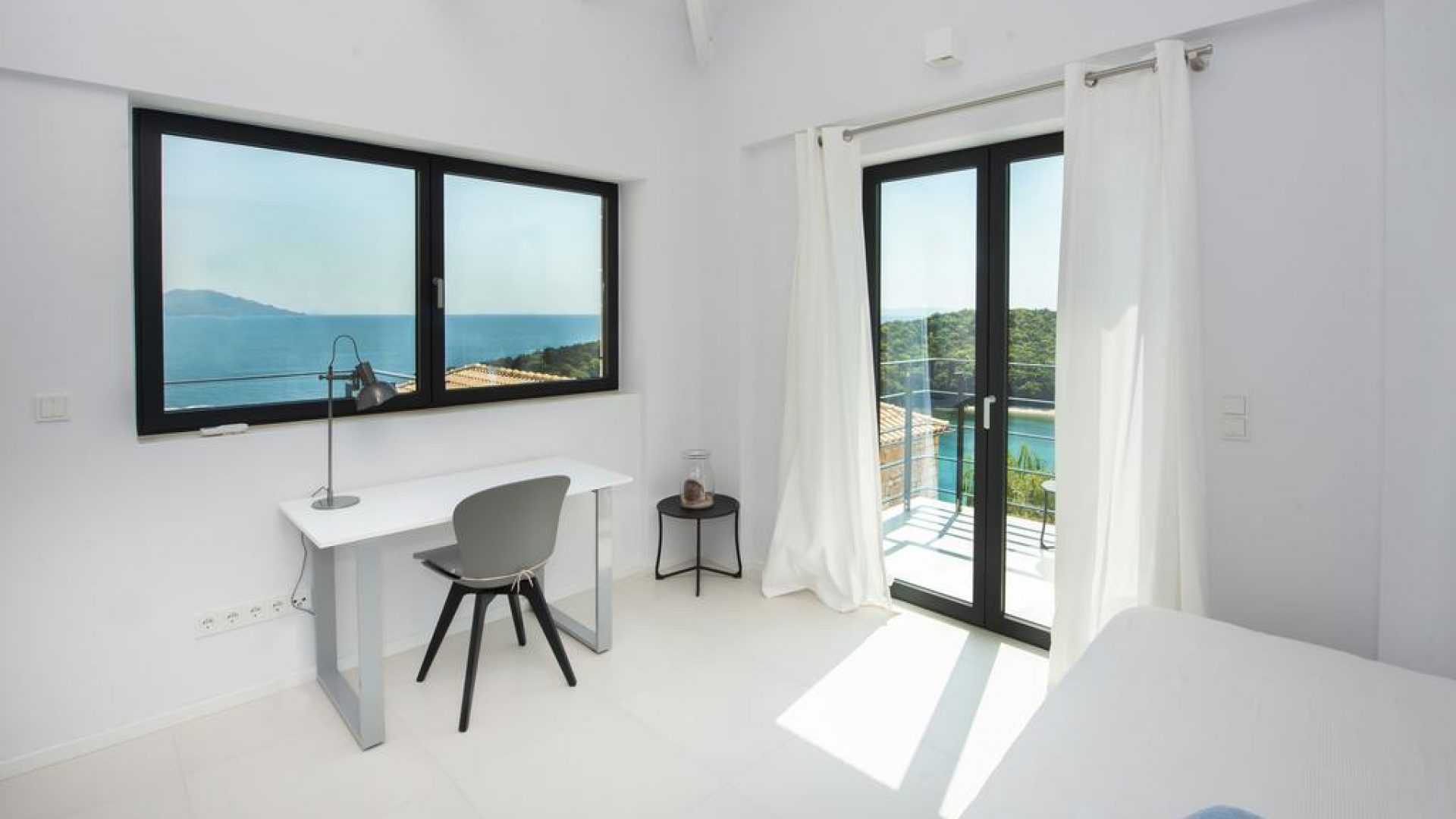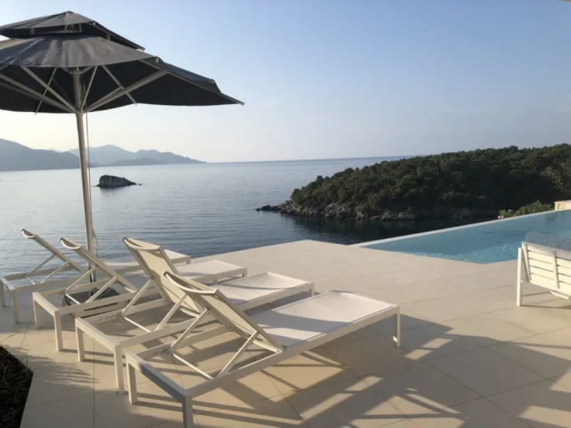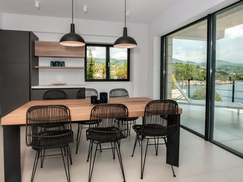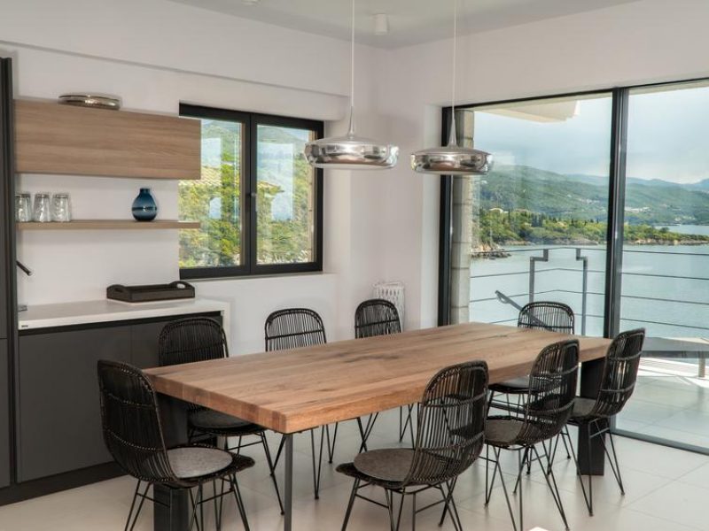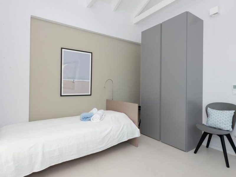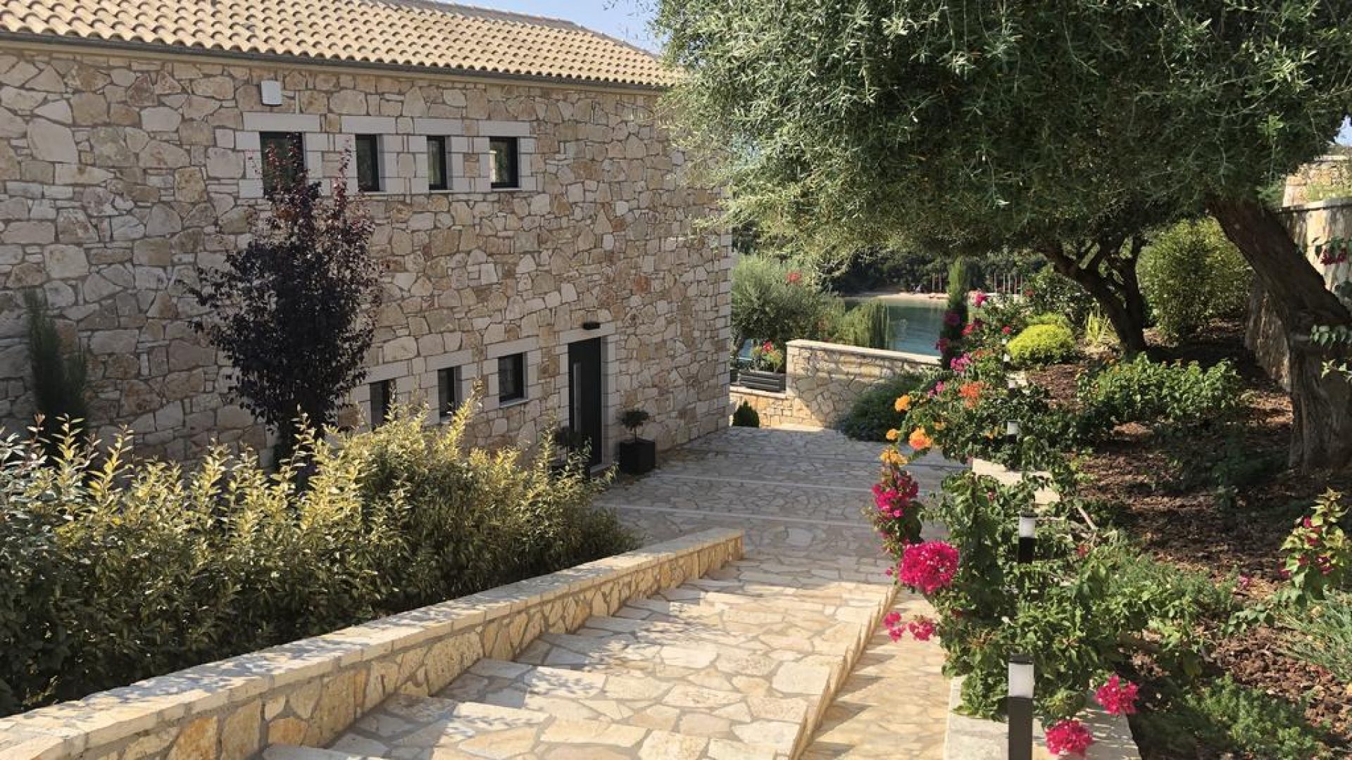 All bedrooms have a wonderful sea view through floor-to-ceiling windows. Below the lower level follows the pool level with sun loungers and an infinity pool. In front of this is a belonging to the villa small hillside garden with olive trees, etc. Next to a narrow path leads directly to a small swimming spot on the water.