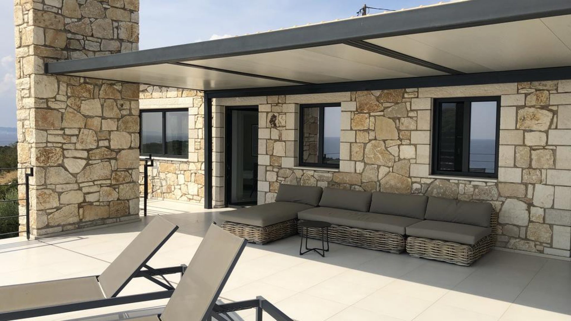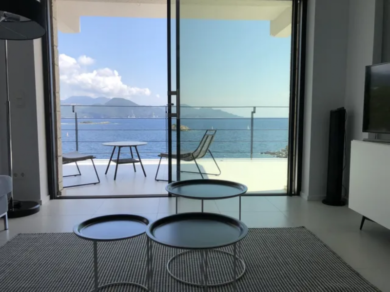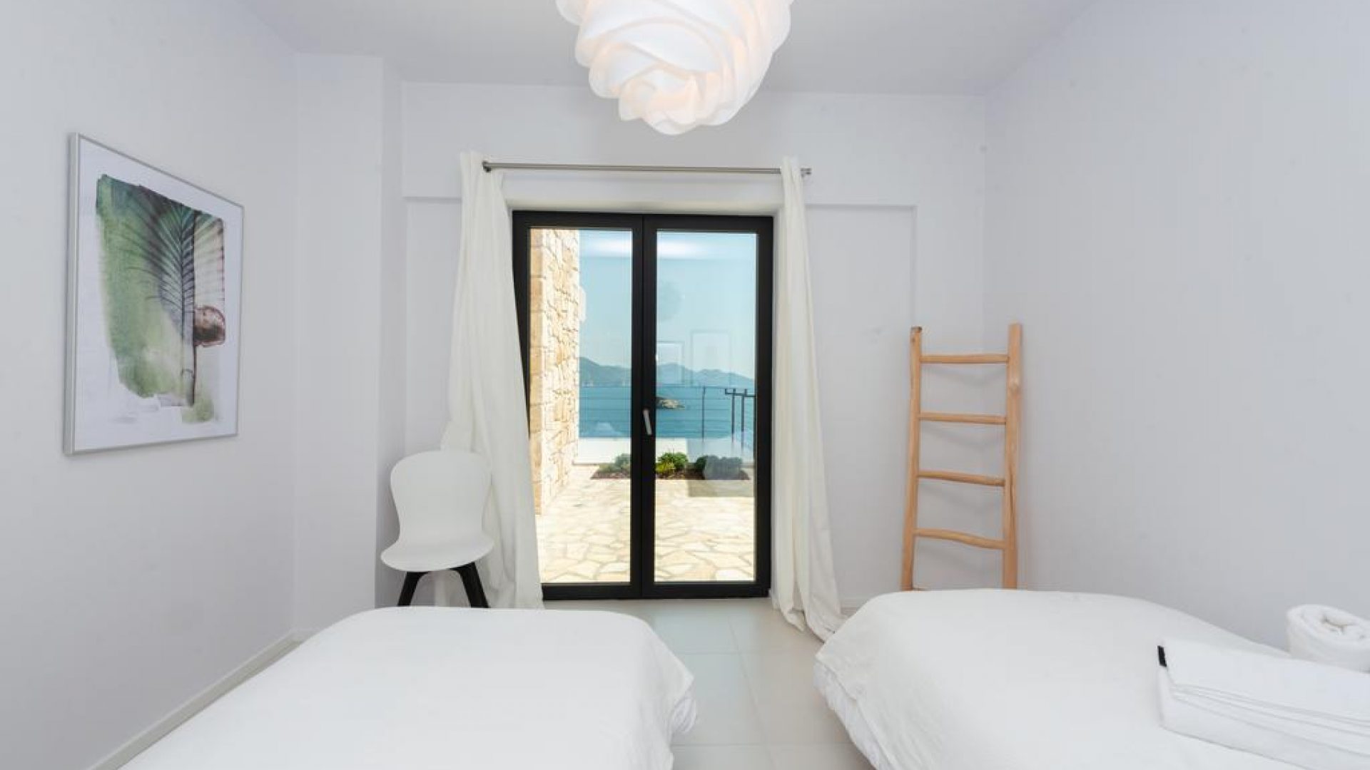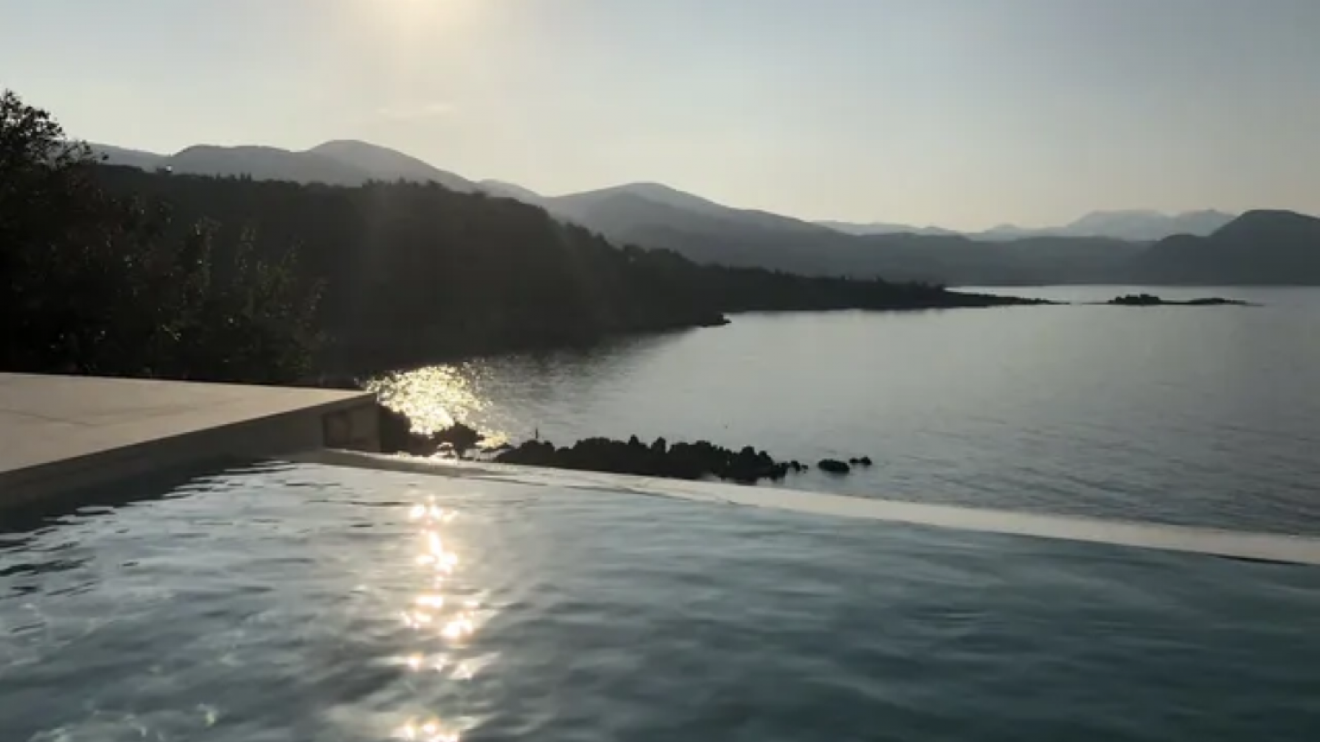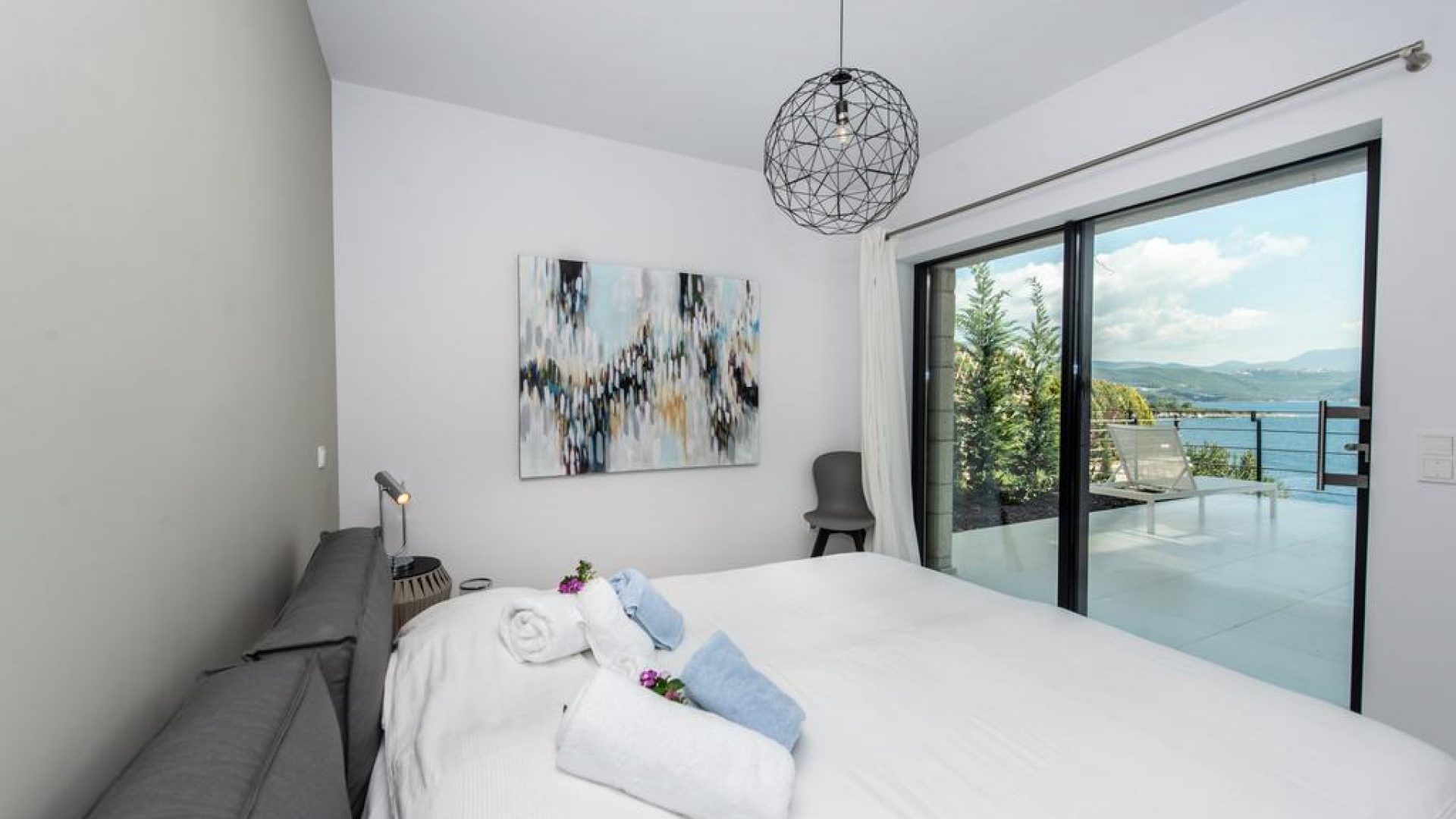 All bedrooms have a wonderful sea view through floor-to-ceiling windows. Below the lower level follows the pool level with sun loungers and an infinity pool. In front of this is a belonging to the villa small hillside garden with olive trees, etc. Next to a narrow path leads directly to a small swimming spot on the water.