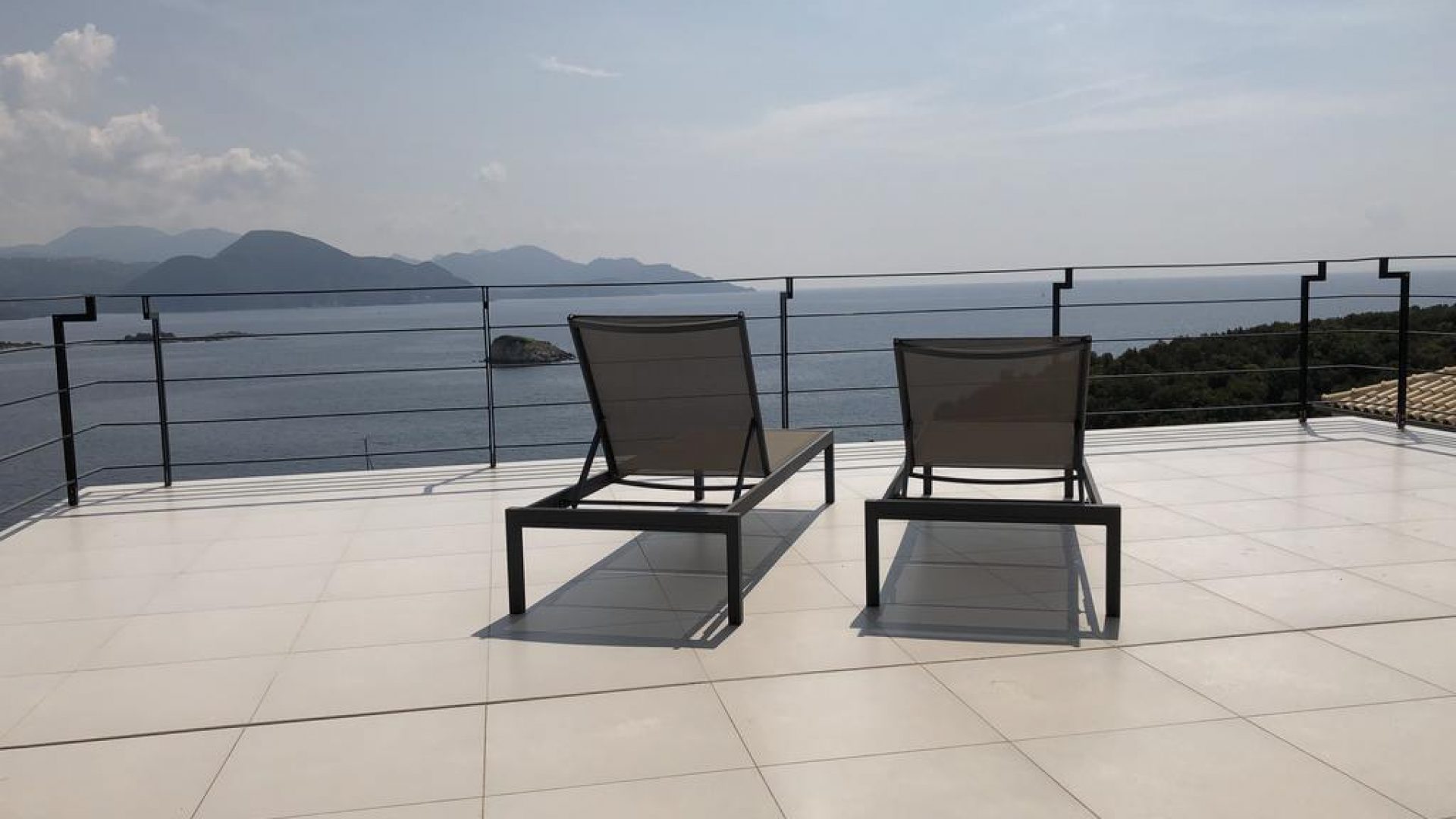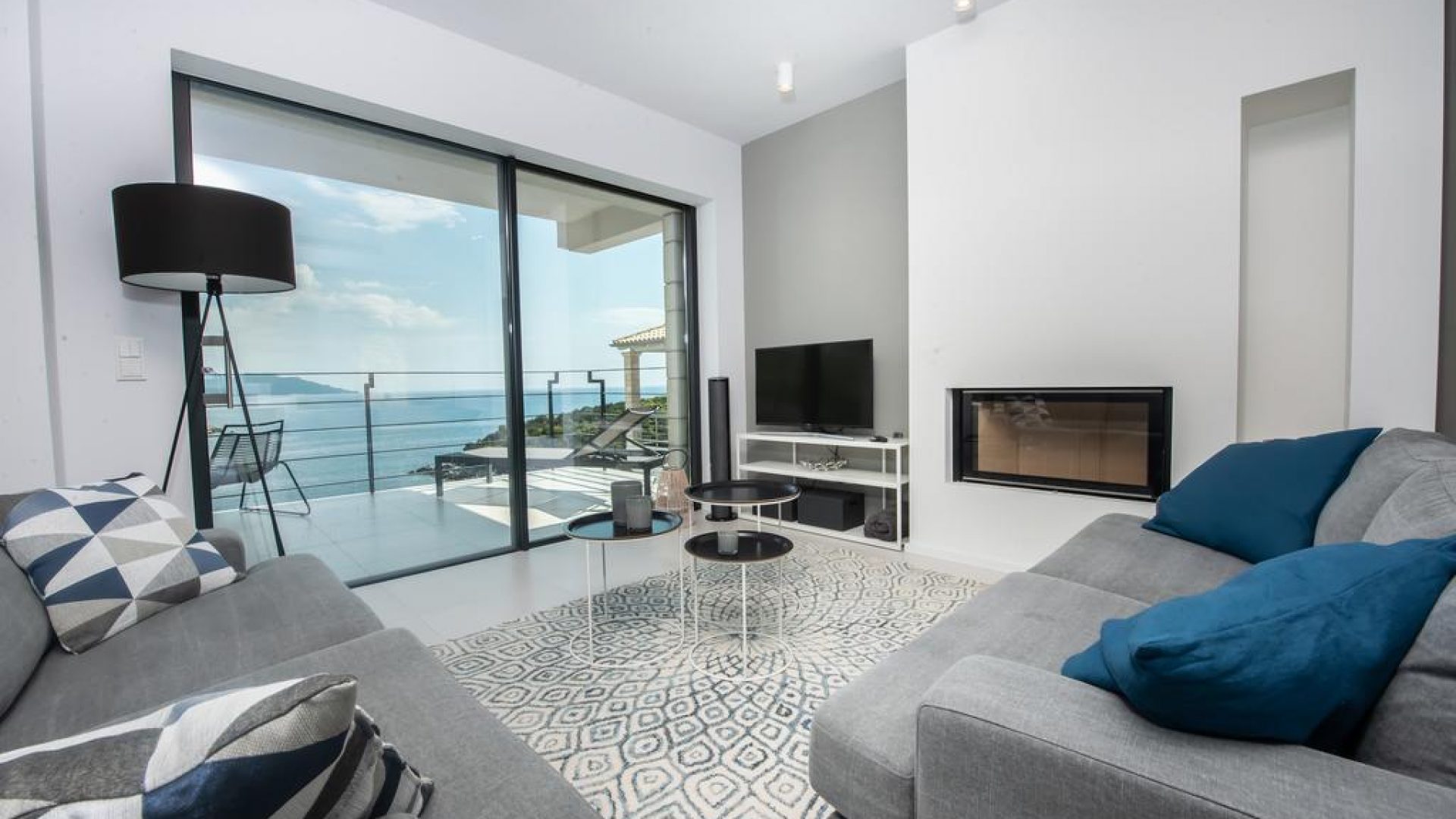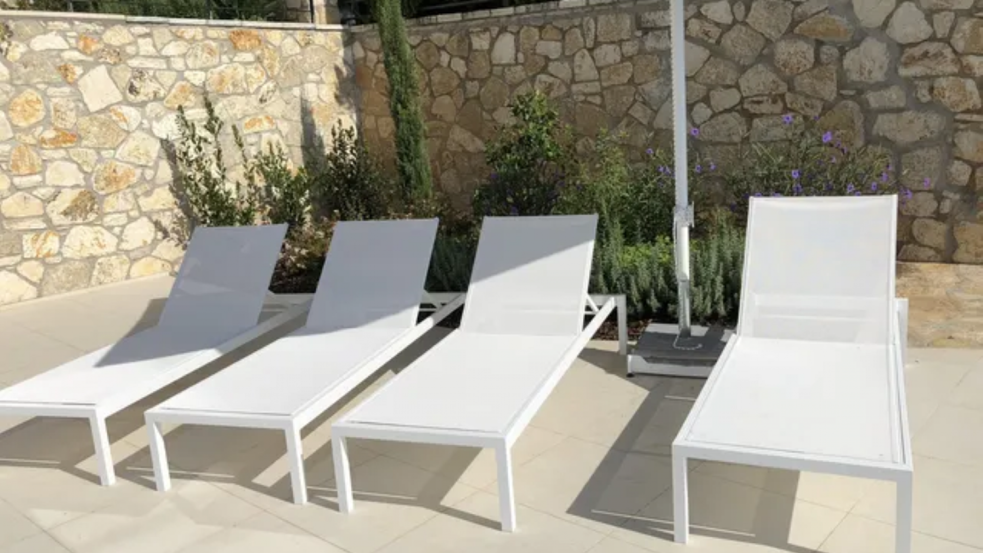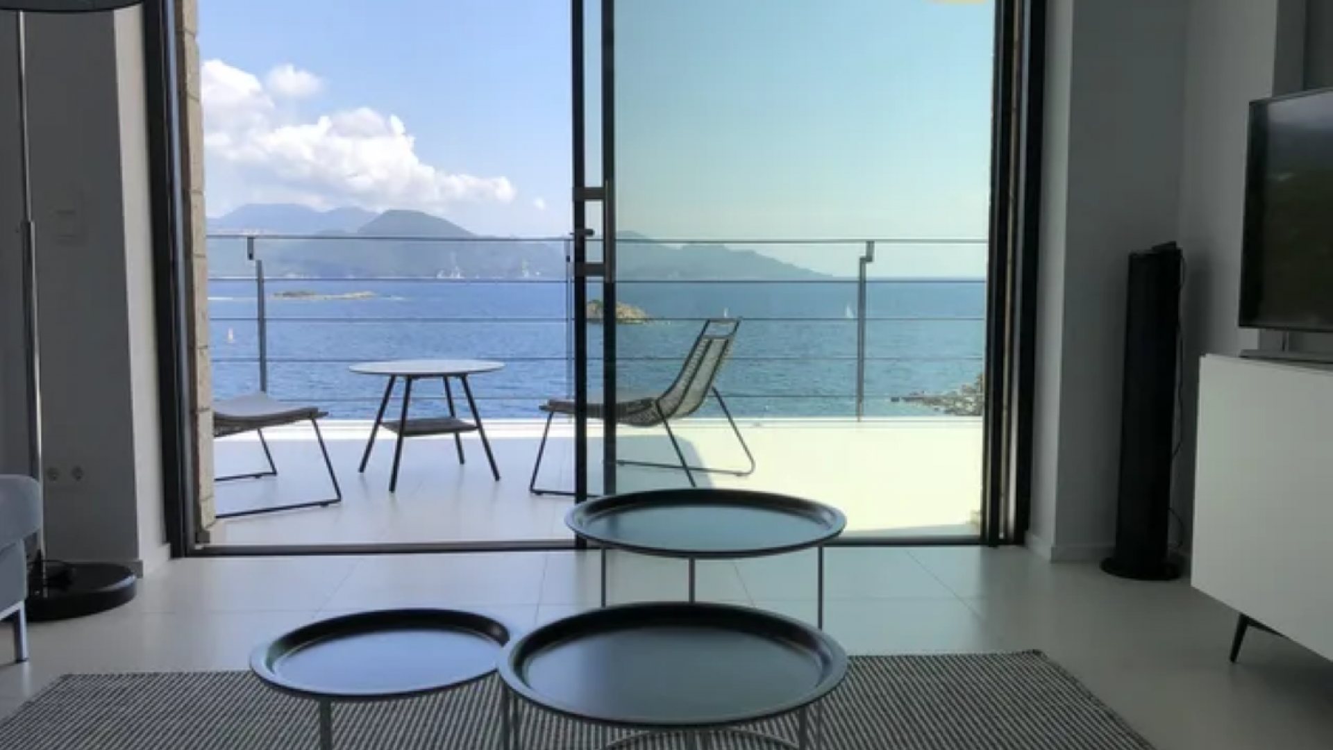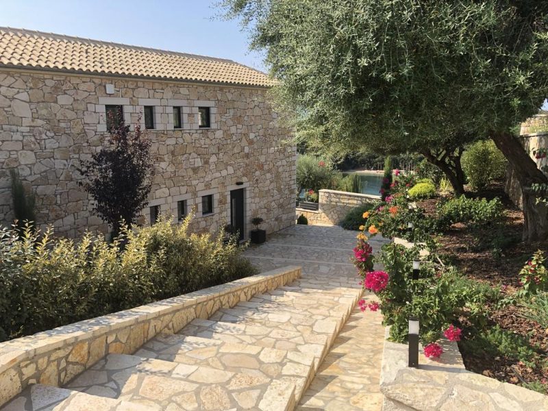 All bedrooms have a wonderful sea view through floor-to-ceiling windows. Below the lower level follows the pool level with sun loungers and an infinity pool. In front of this is a belonging to the villa small hillside garden with olive trees, etc. Next to a narrow path leads directly to a small swimming spot on the water.