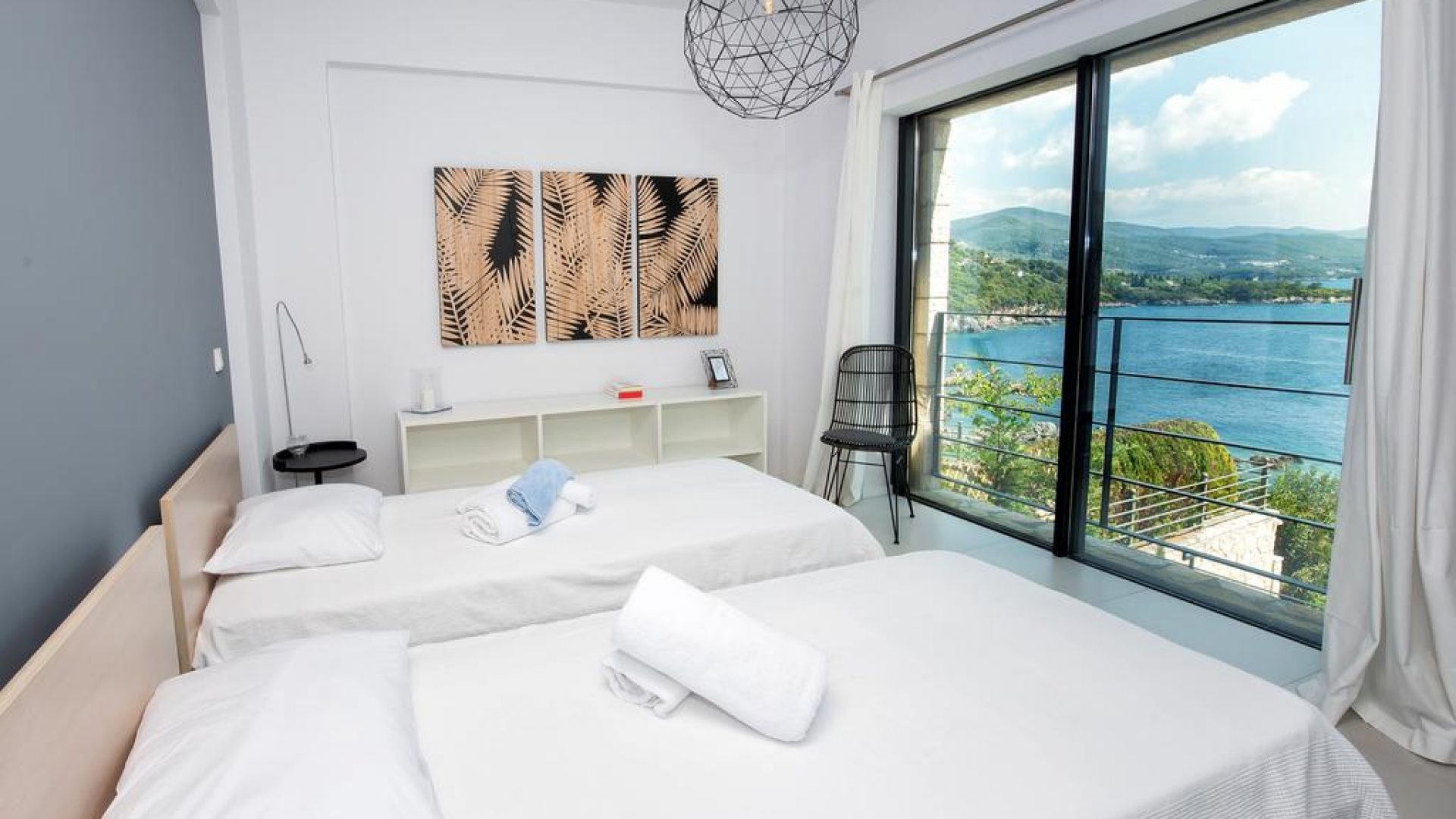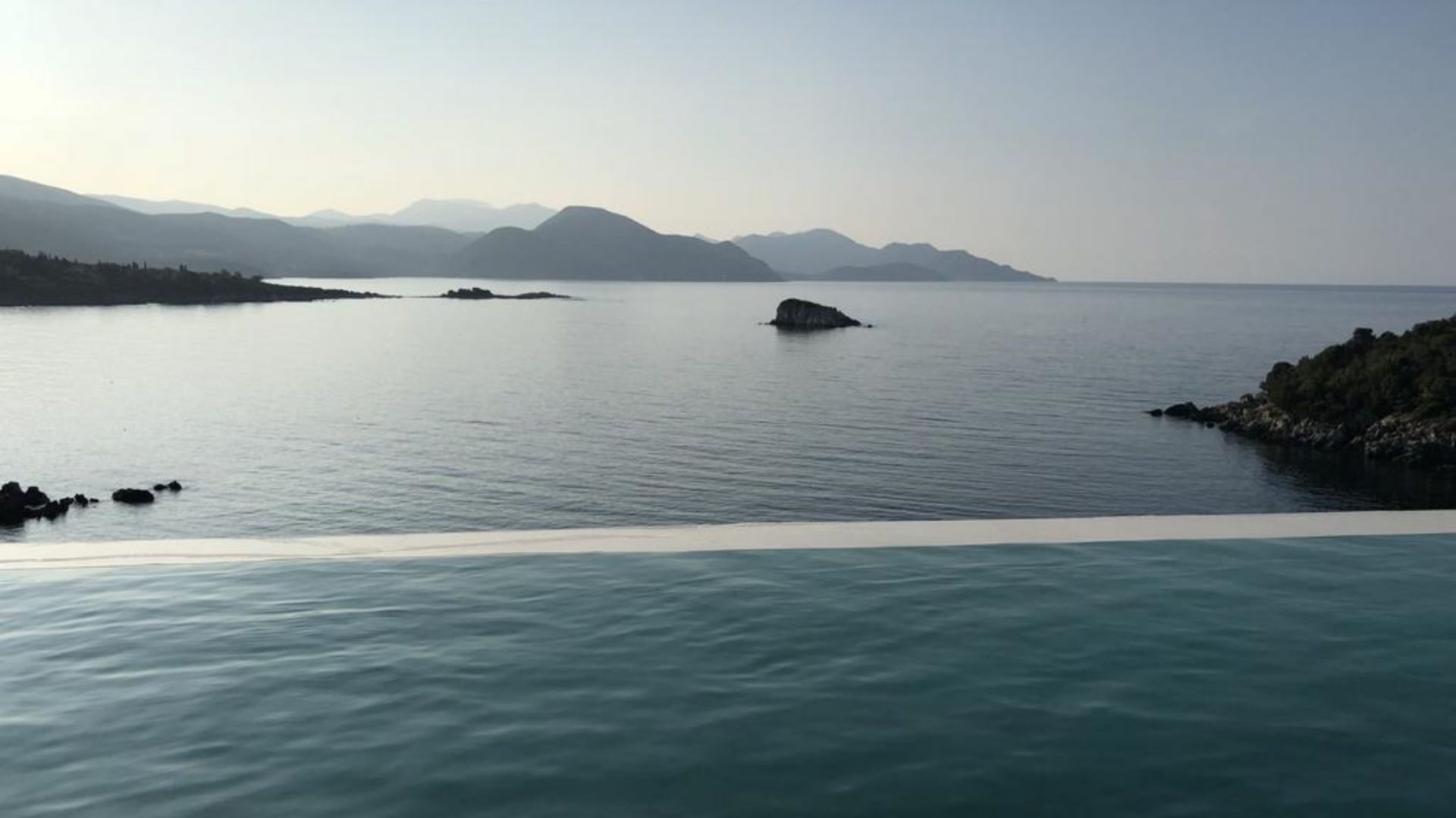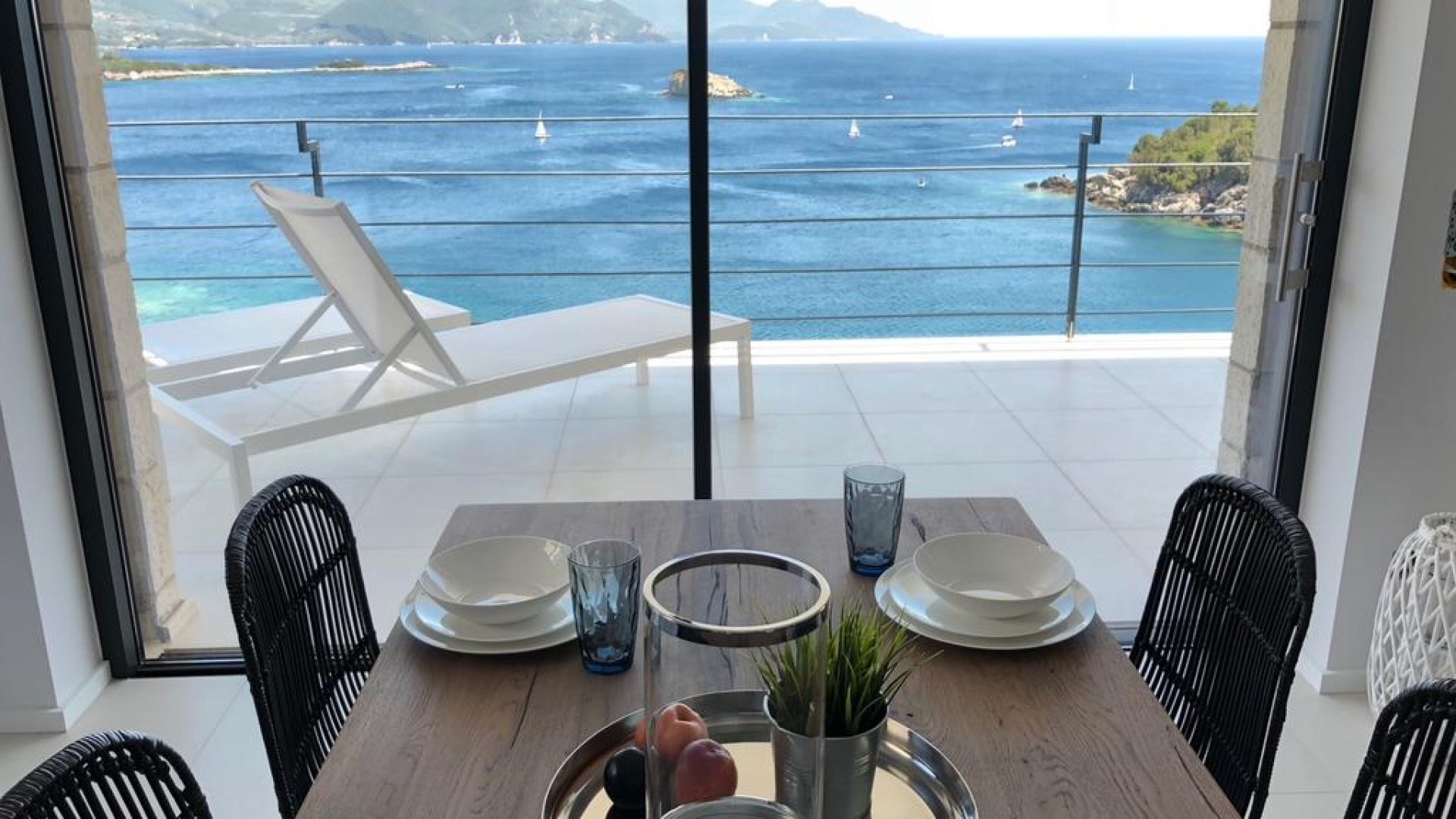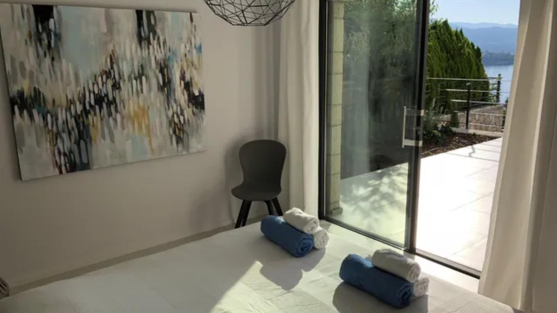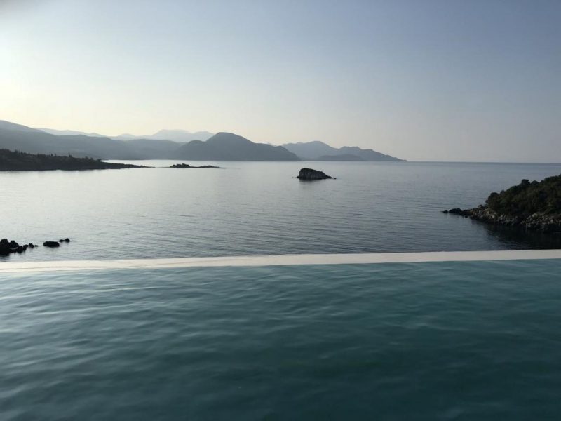 All bedrooms have a wonderful sea view through floor-to-ceiling windows. Below the lower level follows the pool level with sun loungers and an infinity pool. In front of this is a belonging to the villa small hillside garden with olive trees, etc. Next to a narrow path leads directly to a small swimming spot on the water.