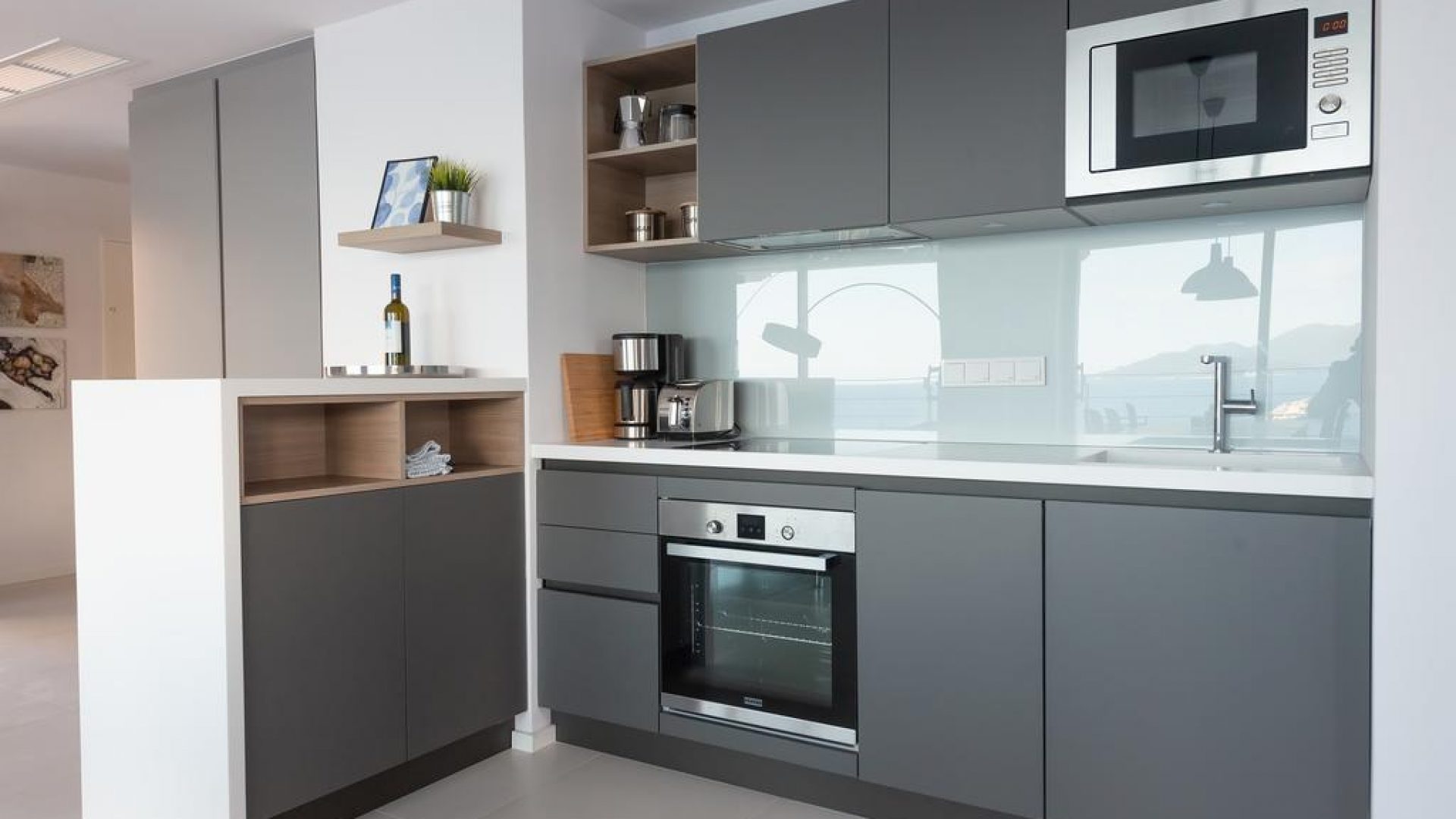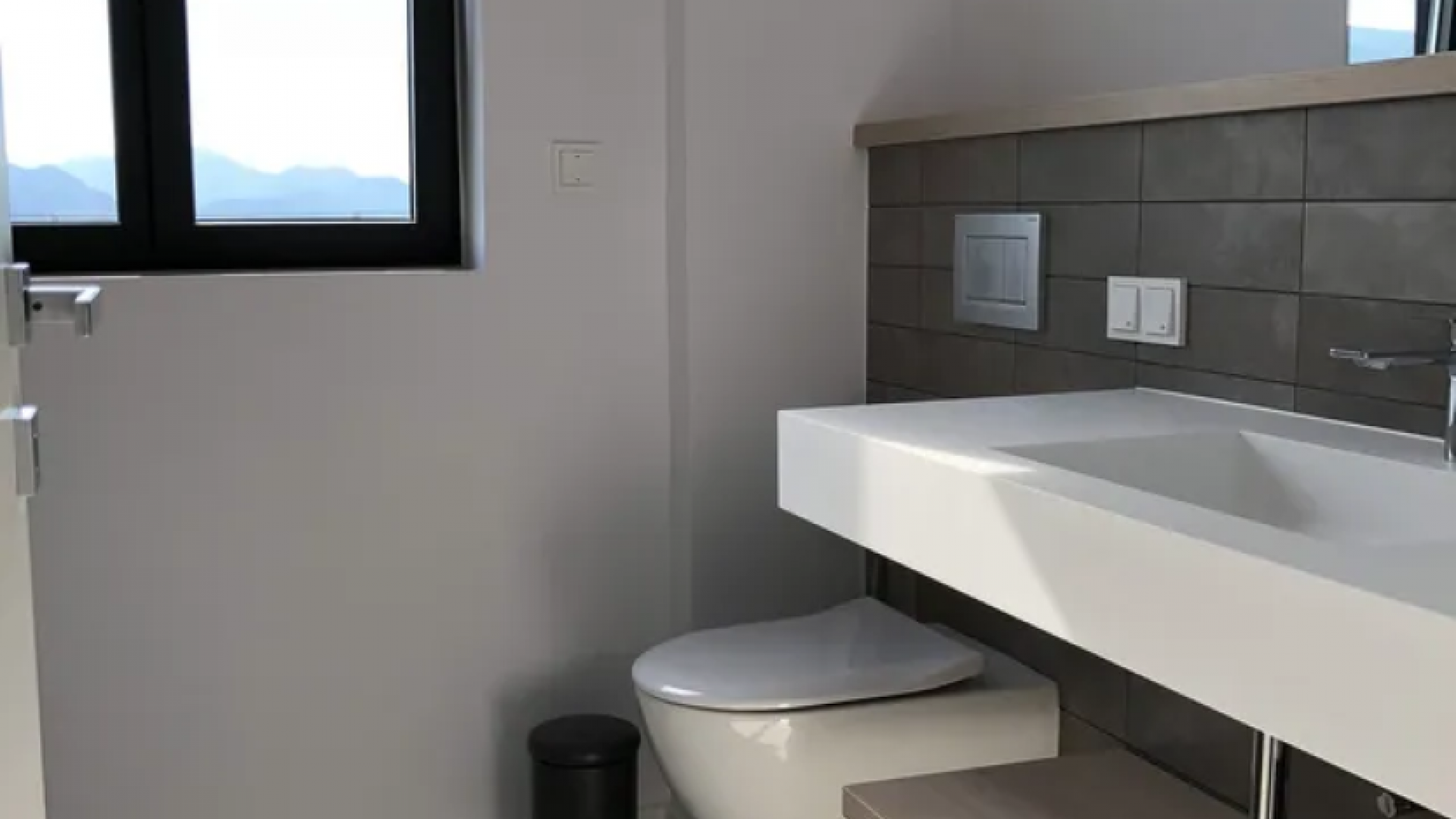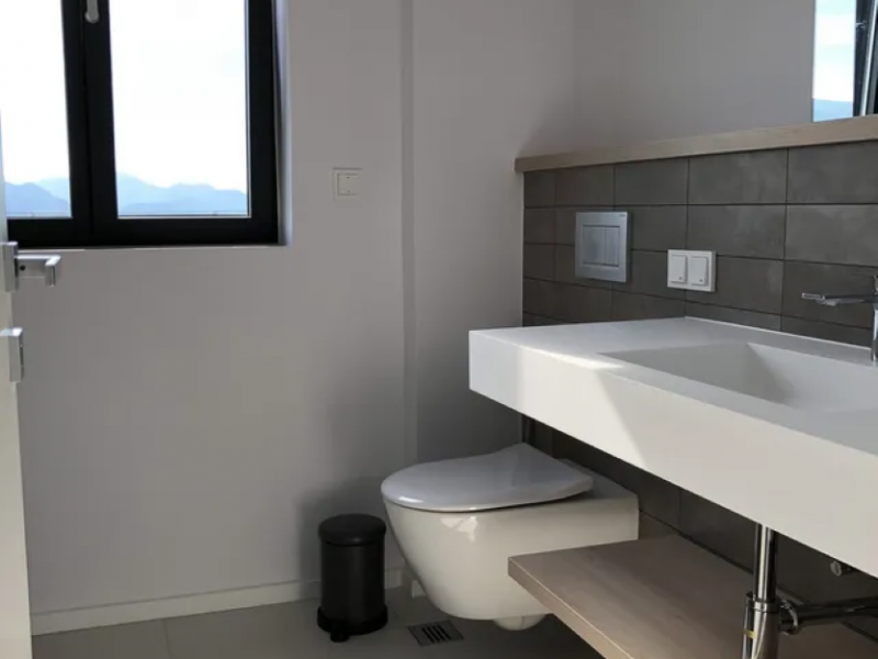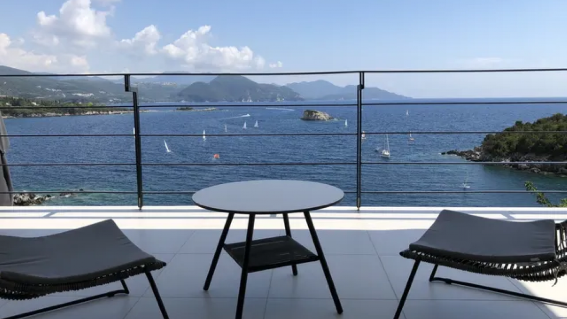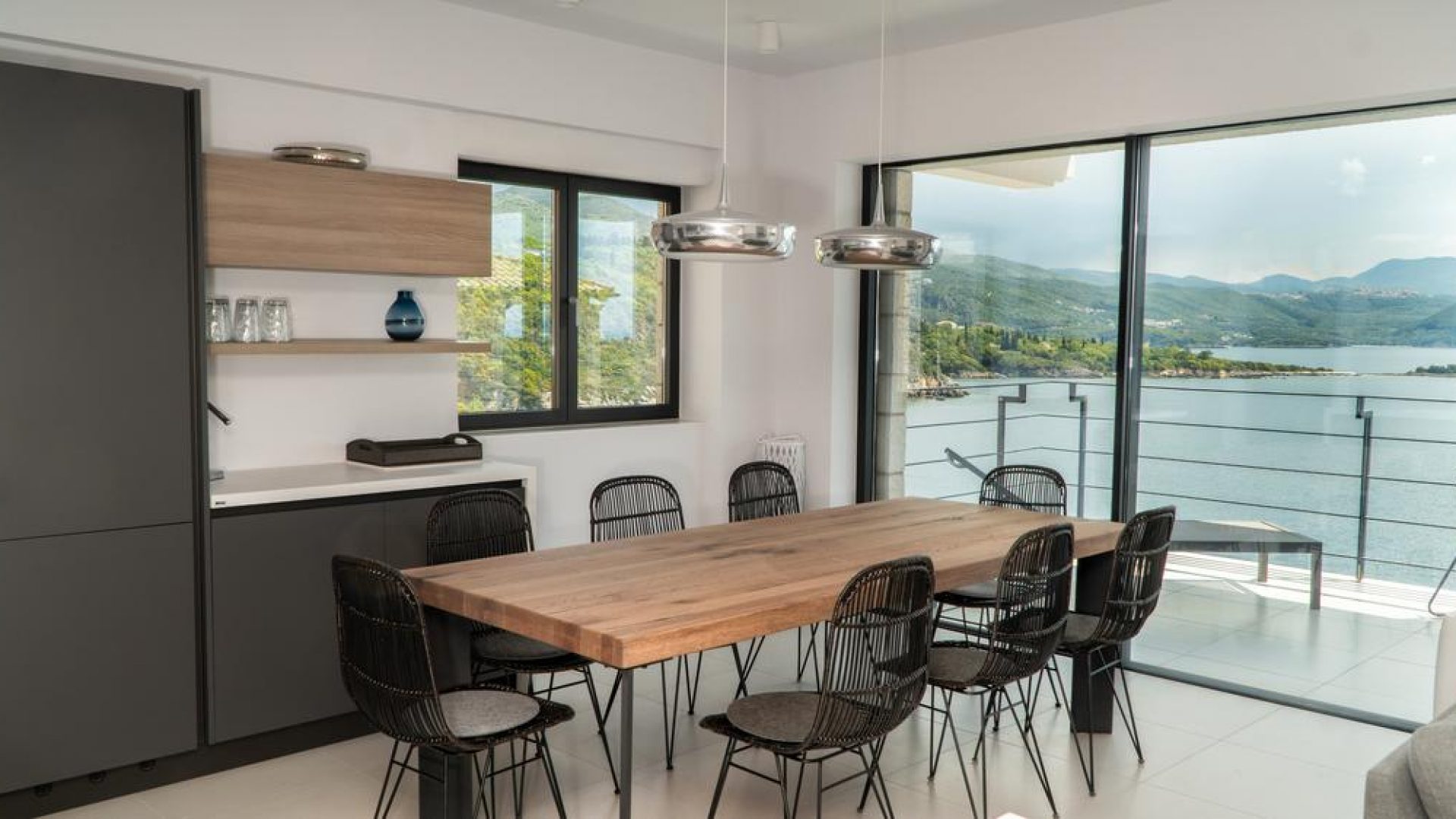 All bedrooms have a wonderful sea view through floor-to-ceiling windows. Below the lower level follows the pool level with sun loungers and an infinity pool. In front of this is a belonging to the villa small hillside garden with olive trees, etc. Next to a narrow path leads directly to a small swimming spot on the water.