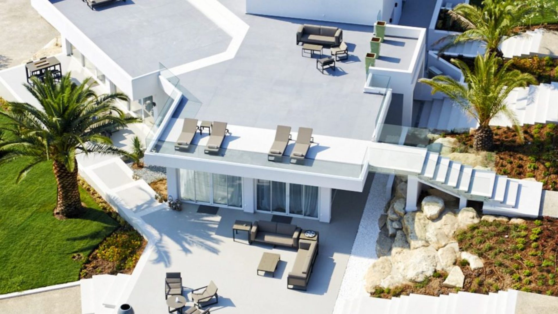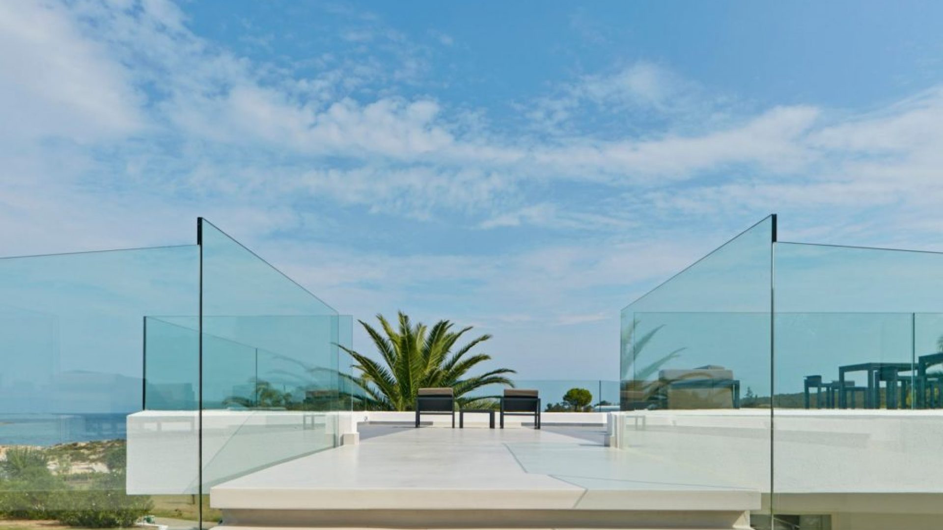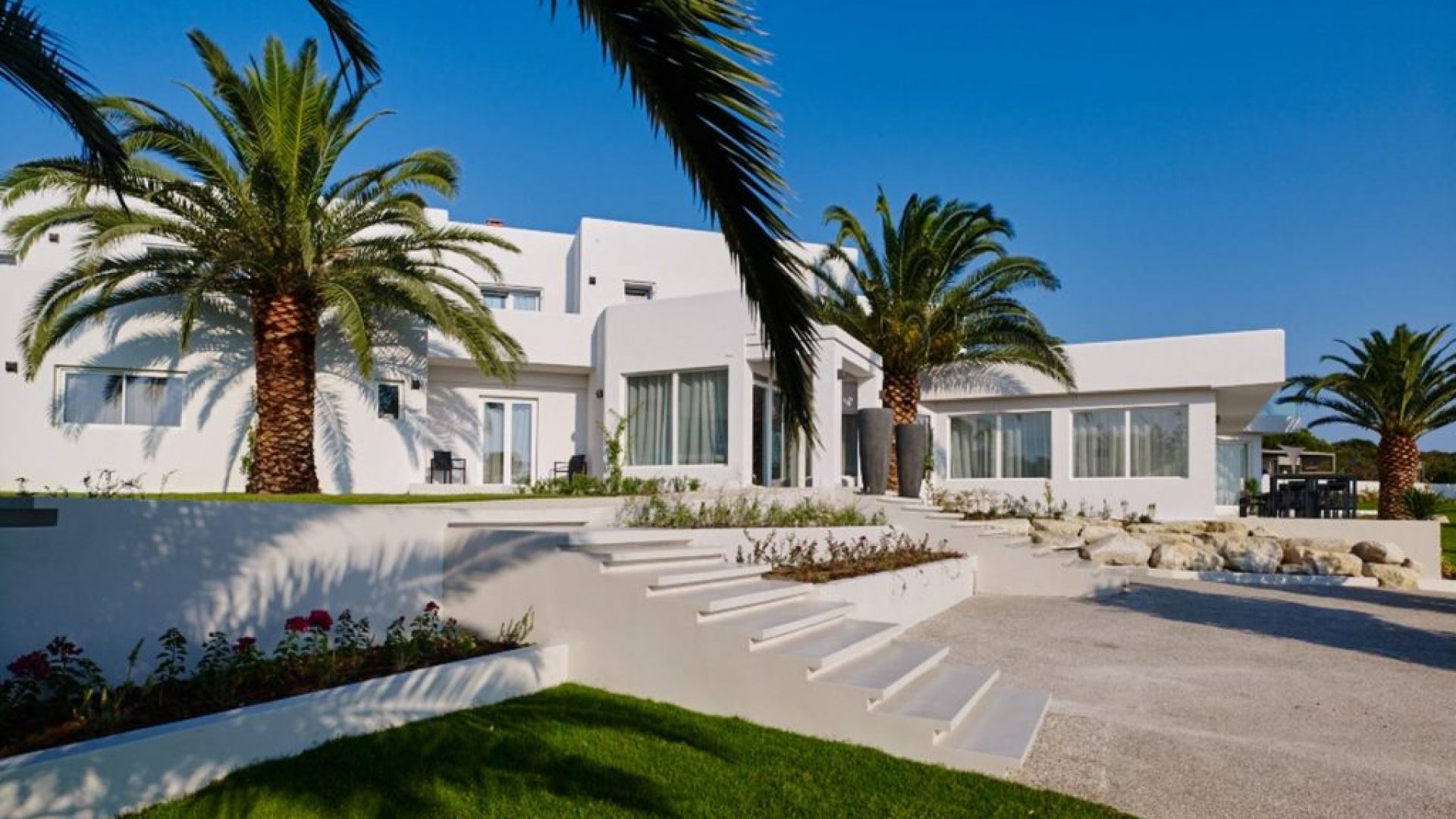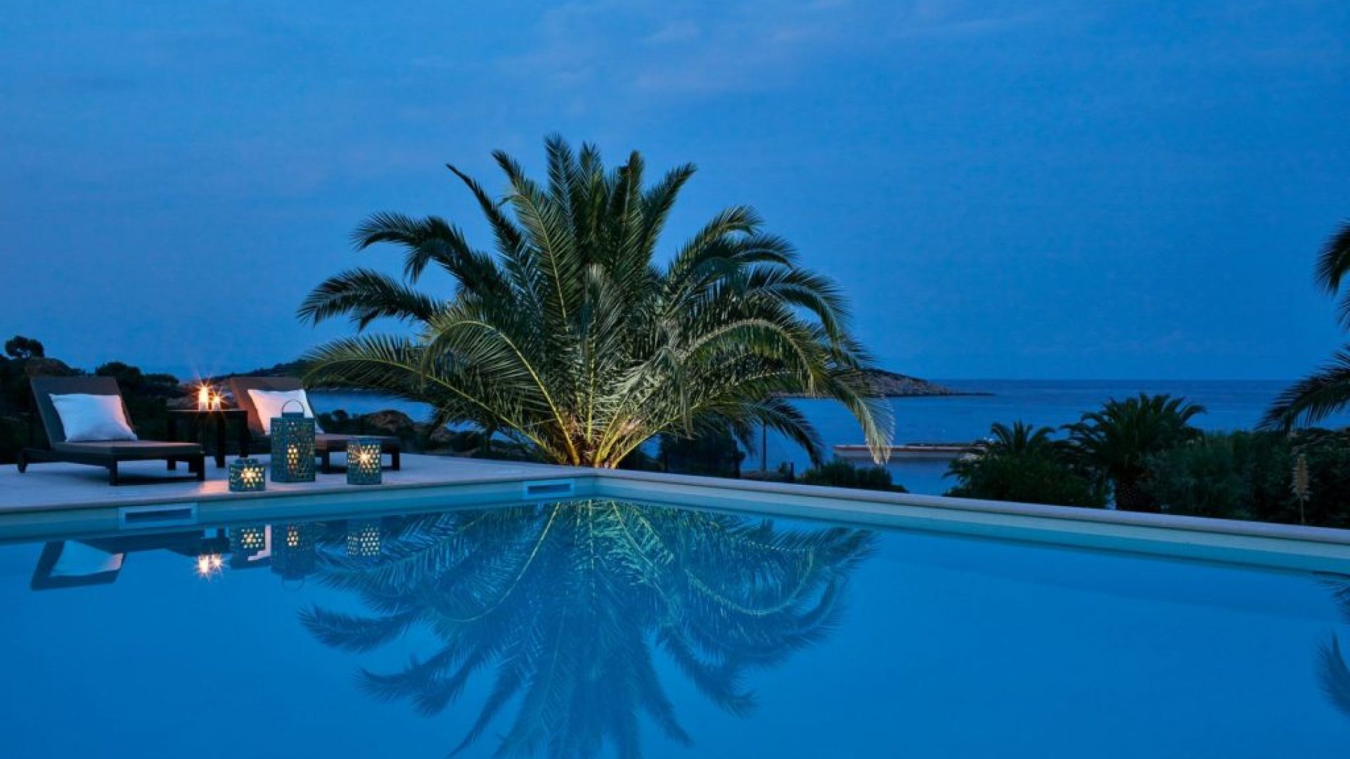 This 10-bedroom architectural jewel is located on the private and unspool island between two natural coves of crystal-clear water.