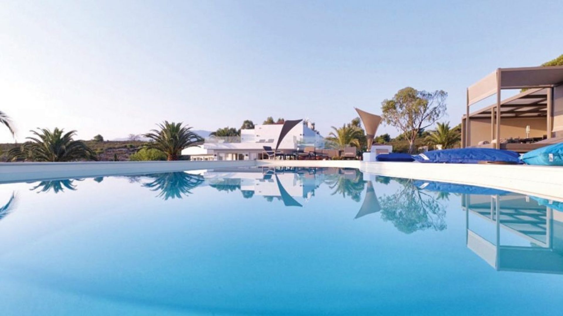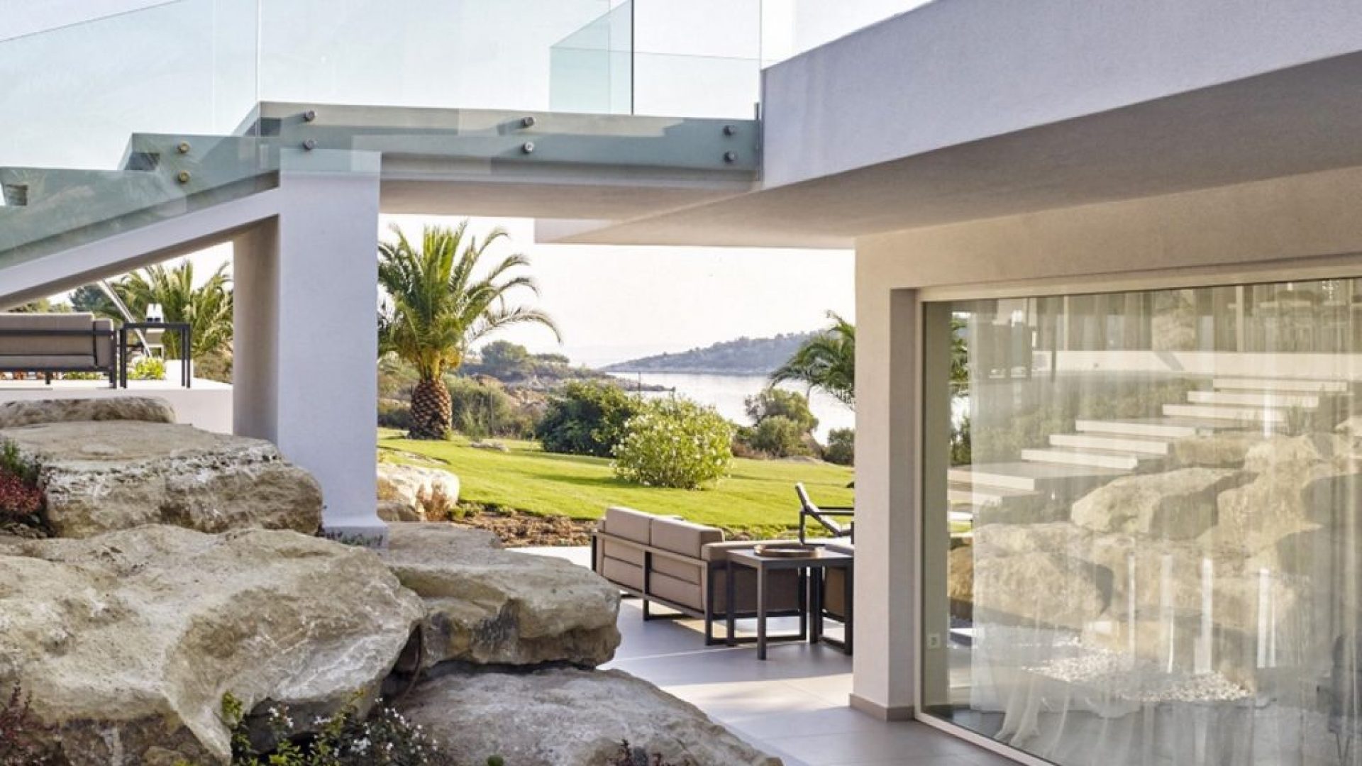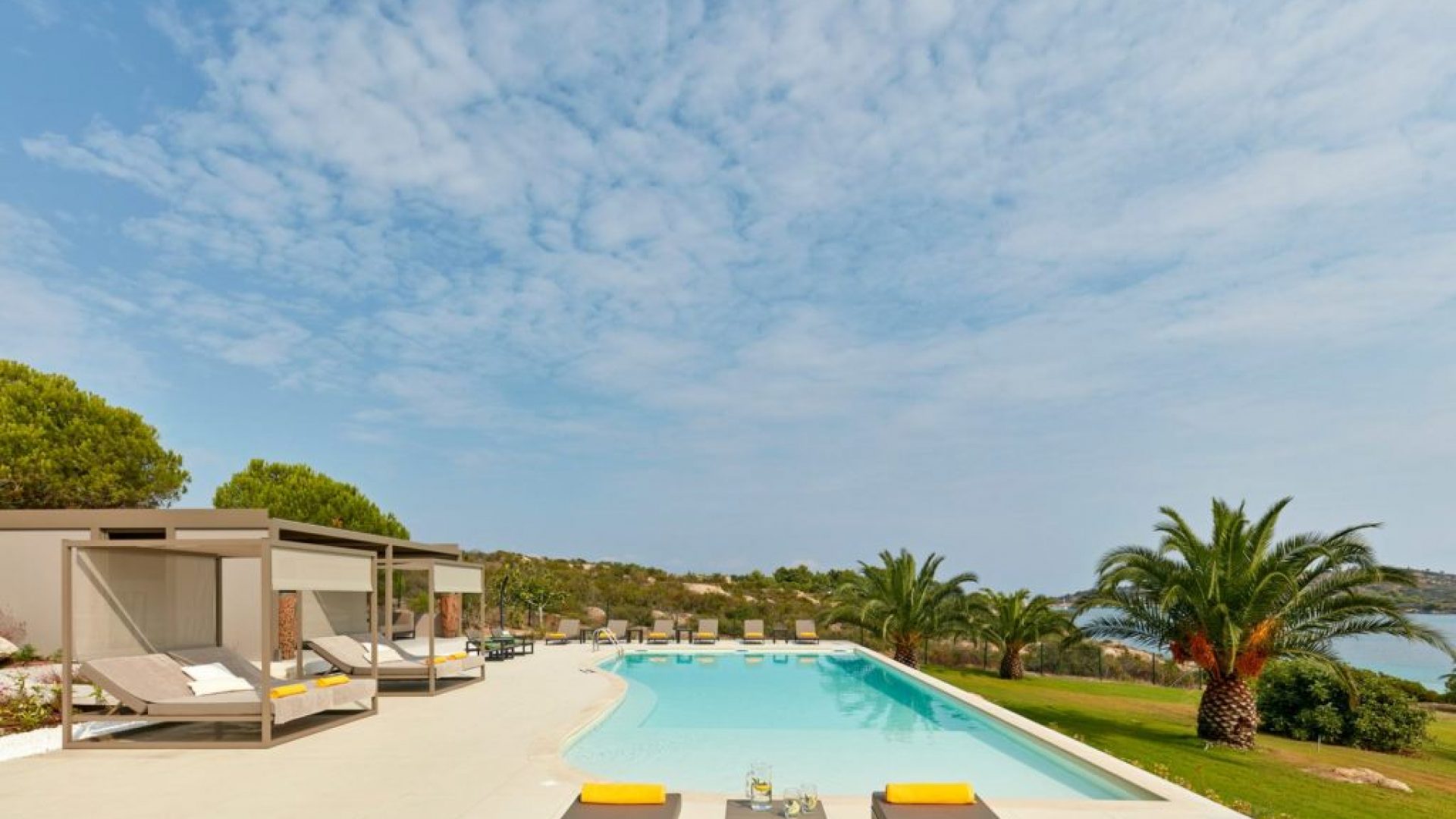 This 10-bedroom architectural jewel is located on the private and unspool island between two natural coves of crystal-clear water.