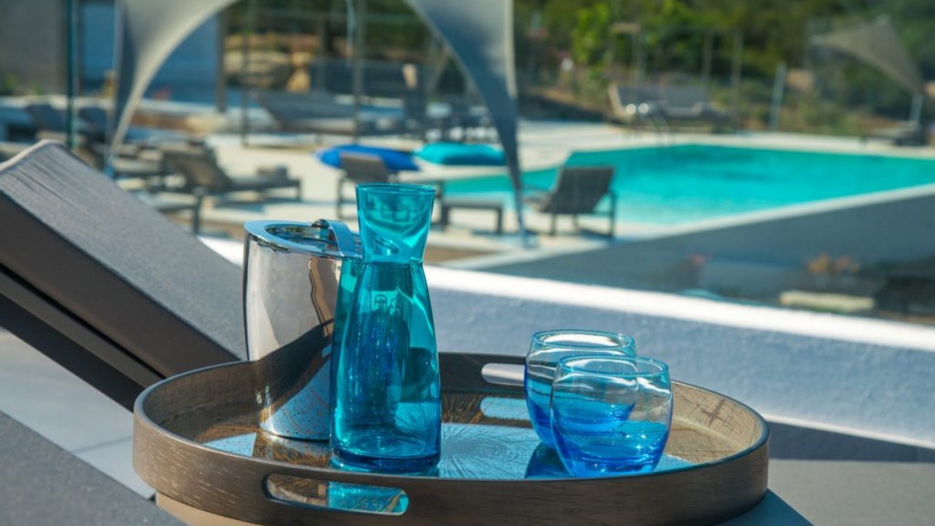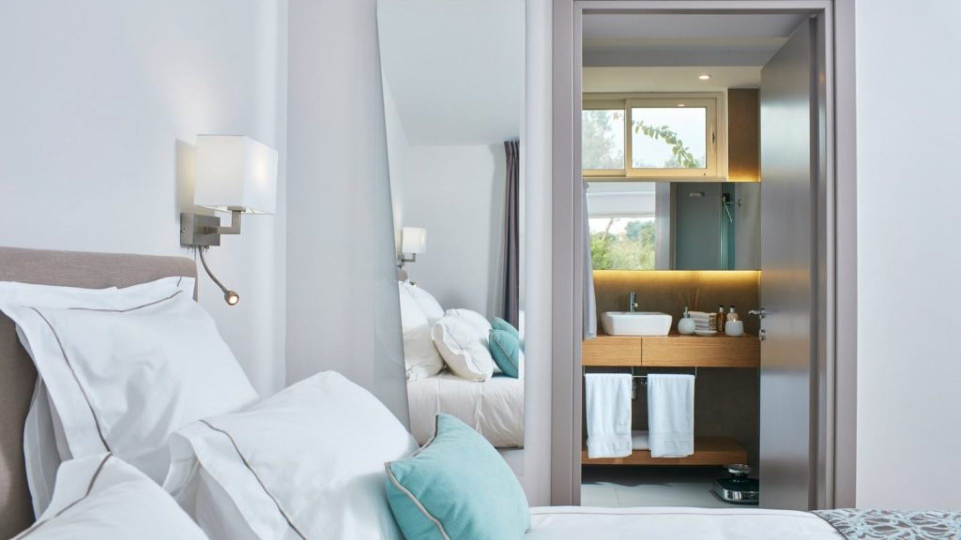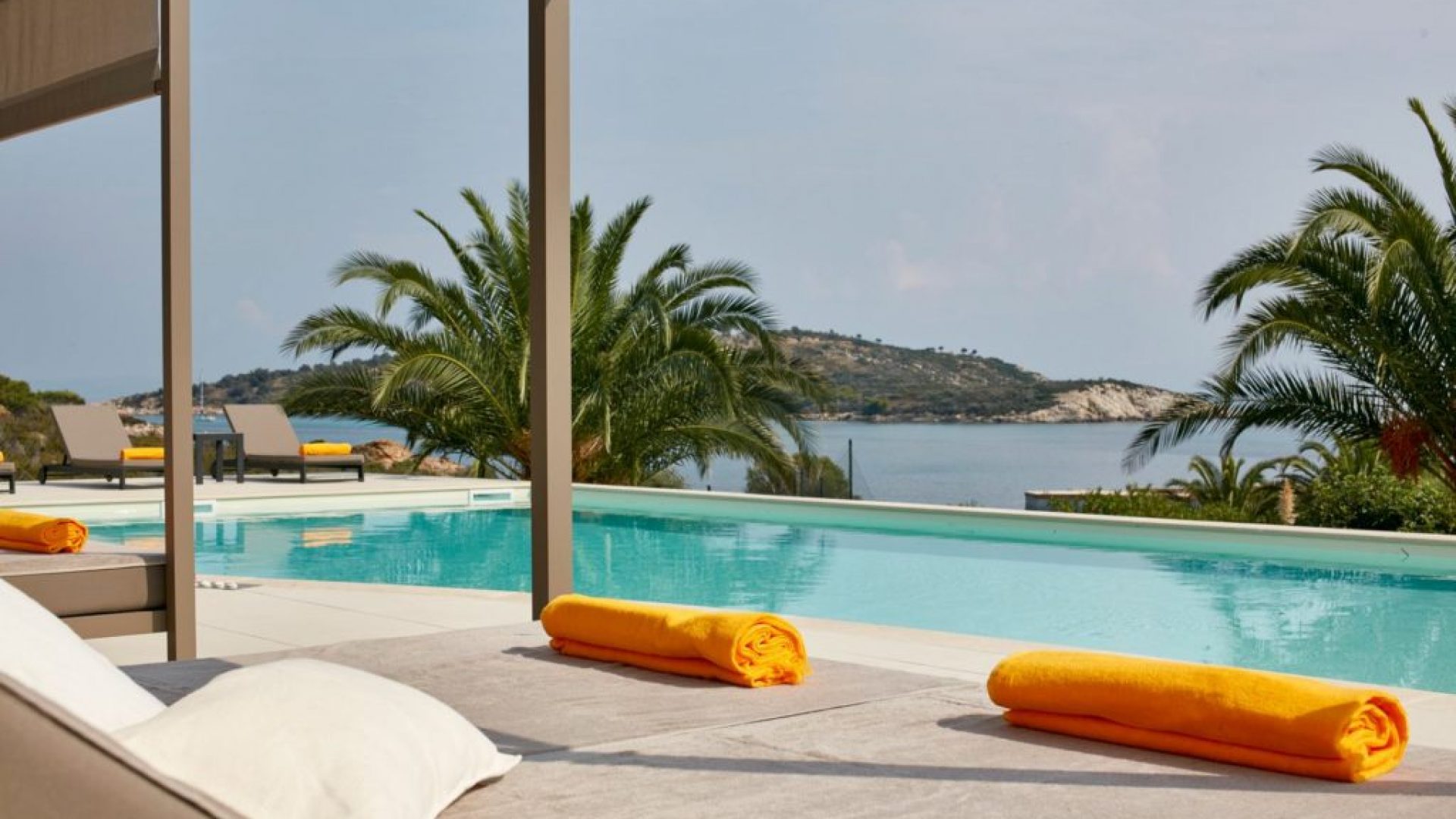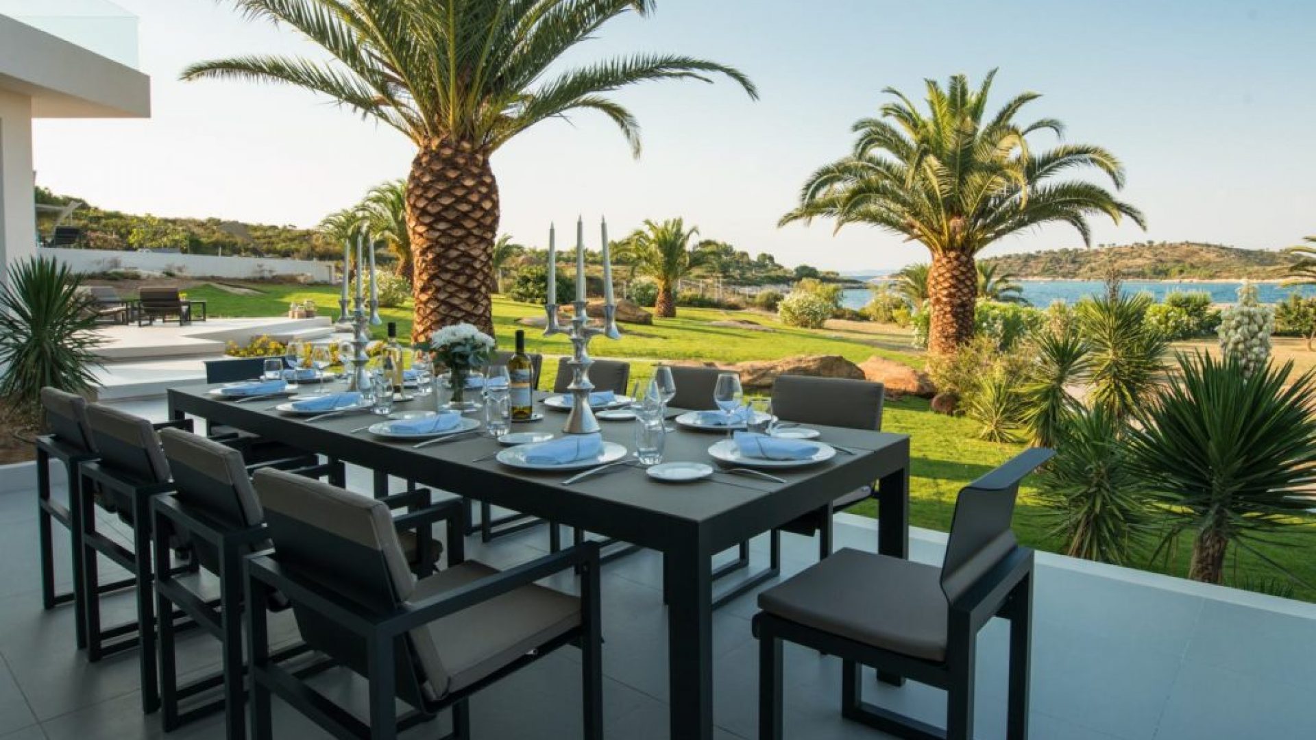 This 10-bedroom architectural jewel is located on the private and unspool island between two natural coves of crystal-clear water.